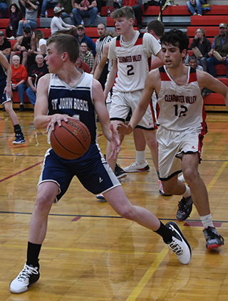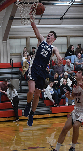 23 points and 11 rebounds.The Patriots took a 14-7 lead by the end of the first quarter and stretched it to 31-14 by halftime. They outscored the Mountaineers 17-2 in the third quarter for a 48-16 lead that led to a running clock for the entire fourth quarter. They held an 8-6 edge in the fourth quarter to win by 34 points. Also scoring in double figures for the Patriots were Luke Stubbers with 15 points and Cody Wassmuth with 11. Levi Wassmuth scored 3 while Stallone Hoene and Clay Weckman each scored 2. Stubbers had the only 3-point goal in the game. Levi Wassmuth topped the Patriots in rebounds with 13. St. John Bosco 14 17 17 8 -56 Meadows Valley 7 7 2 6 -22 SJB-Rauzi 0, 0-0, 0; C. Wassmuth 5, 1-2, 11; Stubbers 7, 0-0, 15; Hoene 1, 0-0, 2; Weckman 1, 0-0, 2; Chmelik 10, 3-3, 23; L. Wassmuth 1, 1-4, 3; Kaschmitter 0, 0-0, 0. 3-pointers-Stubbers. MV-J. Padgett 2, 0-0, 4; Priddy 0, 1-2, 1; Larrea 2, 0-0, 4; Jemigan 1, 2-4, 4; C. Padgett 1, 0-0, 2; Rivas 2, 3-4, 7. 3-pointers-none. Boys at C.V.