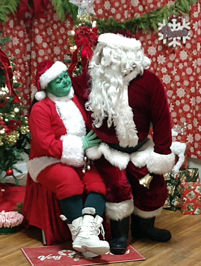 We think Santa is telling the Grinch that "you are in my seat." At Santa's Cabana after the Parade. Click on the photo
