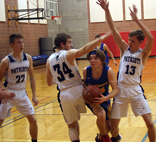 Tory Chmelik, Levi Wassmuth and Like Stubbers defend against Nezperce. Photo by Steve Wherry.