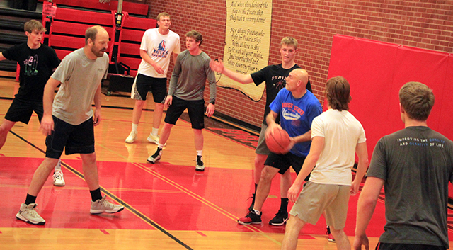 Bruegeman has the ball in the men’s alumni game. Also shown from left