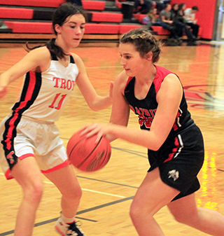 Schlader closed out the 11-0 start.Prairie then went cold on offense as they were held scoreless for nearly 7 minutes as Troy scored 8 straight points to get within 3 at 11-8 with 6:01 left in the half. Lockett finally broke the cold spell with a steal and drive for a basket. Schlader followed with a lay-up on an inbounds play and Wemhoff scored to make it 17-8. Troy then outscored Prairie 2-4 the rest of the half with Gracie Farr scoring Prairie’s only 2 points from the free throw line. Prairie led 19-12 at the half. Prairie opened the third quarter with a 9-0 run to take a 16 points lead. Remacle scored 6 of those 9 points with Wemhoff adding a basket and Schlader a free throw. Troy finally scored with 2:17 left in the quarter and Forsmann answered with a 3-pointer for a 31-14 lead. After Troy scored a basket, Prairie closed out the third quarter with 5 straight points. Schlader scored a basket and a free throw and Forsmann scored a basket to make it 36-16. Troy scored the first 3 points of the fourth quarter then Schlader made a free throw. Just after that Wemhoff picked up her fifth foul on a blocking foul where it appeared she had taken a charge. With Prairie’s primary ballhandler out of the game, Troy ramped up their full-court press and forced several turnovers. Prairie still led by 14 at 39-25 when Schlader went to the bench with 5 fouls with 3:49 left. Troy made one of those two free throws to make it 39-26. Forsmann scored to push the lead back to 15 but Troy answered with a 3-pointer. With 1:56 to play, Remacle made a free throw that turned out to be Prairie’s final point. Several more turnovers led to Troy scoring the final 7 points of the game as they cut the final margin down to just 6 points. If there had been a few more minutes to play, Prairie might have lost despite leading by 20 after 3 quarters. Prairie had 9 of their 23 turnovers in the fourth quarter after Wemhoff fouled out with Forsmann, normally a post player, doing the best job of handling the ball against the pressure. Schlader wound up as the leading scorer with 13 points. Remacle scored 9, Lockett and Forsmann 7 each, Wemhoff 4 and Farr 2. Prairie had a 44-33 edge on the boards led by Forsmann with 11 rebounds, Schlader with 10 and Lockett with 9. Forsmann had 5 steals and Wemhoff had 10 assists. Prairie was 17 for 48 from the field, 35%, and 7 for 22 at the line, 32%. Troy was 13 for 44 from the field, 30%, and 7 for 18 at the line, 39%. Prairie is now 8-2 on the season, 7-1 in league play. The JV was just 2 quarters with Prairie pulling away late for a 31-16 win. The lead changed hands 3 times in the first quarter. Troy led 6-9 but Prairie got a basket each from Geis and Enneking to take a 10-9 lead at the end of the quarter. Geis scored twice on inbounds plays to open the second quarter and give Prairie a 14-9 lead. Troy scored 3 to get back within 2 but a free throw by Sarah Lustig and a steal and ensuing basket by Aubree Rehder made it 17-12. After a Troy free throw, a basket by Enneking and another free throw by Lustig made it 20-13. A Troy basket cut the lead to 5 then Prairie scored 9 straight points to make it 29-15 with 1:34 left. Schumacher scored the first 7 points of the run with 2 baskets plus a 3-pointer. A steal by Schumacher led to a basket by Enneking that ended the run. Troy scored a free throw with 24 seconds left but Schumacher capped things with a drive to the hoop with 10 seconds to play for a 15 point win. Schumacher wound up with 12 points on 5 for 8 shooting to lead the scoring. Geis scored 7, Enneking 6, Rehder 4 and Lustig 2. Troy had a 15-20 rebounding edge. Enneking led Prairie with 5 rebounds with Lustig adding 4. Schumacher had 5 steals and 3 assists with Enneking had 2 steals and 3 assists. The JVs were 13 for 26 from the field, 50%, and 3 for 13 at the line, 23%. Troy was 5 for 16 from the field, 31%, and 6 for 16 at the line, 38%. The JV team also won against Clarkston on Friday, Jan. 7 by a blowout score of 75-8. Prairie 11 8 17 6 -42 Troy 4 8 4 20 -36 Prairie-Wemhoff 2-6, 0-0, 4; Lockett 3-12, 1-6, 7; Remacle 4-7, 1-2, 9; Schlader 5-12, 3-8, 13; Forsmann 3-9, 0-1, 7; Rehder 0-1, 0-0, 0; Klapprich 0-0, 0-0, 0; Farr 0-1, 2-4, 2; Walsh 0-0, 0-0, 0. 3-pointers-Forsmann Troy-Chamberlin 1-6, 0-0, 2; Blazzard 2-6, 3-5, 7; Bohman 0-7, 0-0, 0; Raasch 5-10, 2-7, 13; Foster 0-1, 0-0, 0; Morgan 4-8, 2-4, 12; McKenzie 0-2, 0-0, 0; Hawley 1-3, 0-2, 2; Tyler 0-1, 0-0, 0; Phillis 0-1, 0-0, 0. 3-pointers-Morgan 2, Raasch. ![]() ![]() Laney Forsmann puts up a 3-point shot against Kendrick. ![]() Molly Johnson looks to shoot against Kendrick. ![]() Tara Schlader is about to shoot in the game at Troy. ![]() Kristin Wemhoff goes past a Troy defender. ![]() Gracie Farr handles the ball at Troy. ![]() Ali Rehder at Troy. ![]() Isabella Walsh with the ball at Troy. PIRATES GIRLS BASKETBALL SCHEDULE FOR