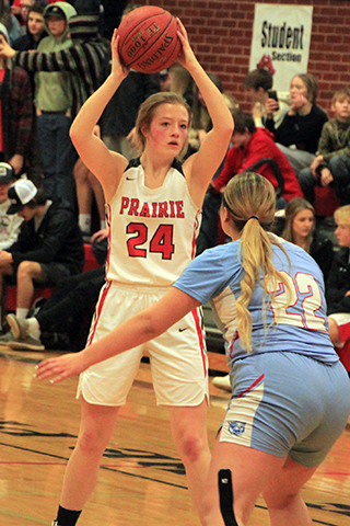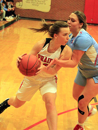 In the game at Genesee Prairie jumped out to a 21-2 lead by the end of the first quarter.Genesee outscored them in the second quarter, but only by 2 points as Prairie led 37-20 at the half. Prairie blitzed Genesee in the third quarter, outscoring them 24-7 to take a 61-27 lead into the fourth quarter. The final period was played with a running clock. Prairie had 4 scorers in double figures led by Delanie Lockett with 18 points. Kristin Wemhoff added 17, Laney Forsmann scored 13 and Tara Schlader scored 10. Also scoring were Ali Rehder and Josie Remacle with 4 points each. Lockett had 10 rebounds to lead the team. Wemhoff had 8 steals and 7 assists. Prairie also won the JV game 62-26. Prairie 21 16 24 5 -66 Genesee 2 18 7 10 -37 Prairie-Wemhoff 7, 0-0, 17; Lockett 6, 4-5, 18; Remacle 1, 2-2, 4; Schlader 5, 0-0, 10; Forsmann 6, 0-0, 13; Rehder 2, 0-0, 4; Klapprich 0, 0-0, 0; Enneking 0, 0-0, 0; Farr 0, 0-0, 0. 3-pointers-Wemhoff 3, Lockett 2, Forsmann. Genesee-Leseman 3, 0-0, 8; Seubert 4, 2-3, 12; Hanson 0, 0-0, 0; Monk 2, 5-7, 11; Mayer 0, 0-0, 0; Flodin 1, 0-1, 2; Barber 2, 0-0, 4; Jensen 0, 0-0, 0; Meyer 0, 0-0, 0; English 0, 0-0, 0. 3-pointers-Seubert 2, Leseman 2, Monk 2. Vs. Lapwai