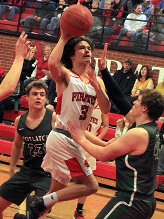 and pulled away for a big win.![]() The Pirates started out playing man defense full court and Potlatch was able to burn them for some transition baskets. The Loggers got on the board first with a 3-pointer but Rambo answered with a lay-up. Forsmann then scored to give Prairie their first lead. Potlatch got one of their transition baskets then added a putback for a 4-7 lead. Forsmann scored inside to make it 6-7. The Loggers then scored 5 straight for a 6-12 lead. Coach Shawn Wolter then called timeout to switch up the defense. Prairie ended the first quarter with an 8-0 run. Forsmann scored on a nice post move then added 2 free throws. He rebounded his own missed shot and put it in to tie the game at 12-12. Hanson then scored a lay-up to give Prairie a 14-12 lead at the end of the quarter. Rambo sank a midrange jumper to open the second quarter and then scored on an inbounds feed from Ross to make it 18-12. A Potlatch basket was answered by a 3-point play by Forsmann that made it 21-14 with 4:59 left in the half. Neither team scored for the next 4 minutes with Potlatch breaking the dry spell with a pair of free throws. Forsmann then closed out the half with a lay-up to make it 23-16 at the break. Prairie opened the second half with a 3-pointer each by Schumacher and Rambo to push their lead to 13 at 29-16. The zone continued to stymie the Loggers who scored just 5 points in the quarter. After a 3 by Potlatch made it 31-21, the Pirates closed out the quarter with 8 straight points. Poxleitner scored a free throw. Rambo sank a 3, Forsmann made 2 free throws and Rambo drove for a lay-up to make it 39-21 after 3 quarters. Prairie then scored the first 6 points of the fourth quarter to make it 14 straight points. Forsmann made a free throw, Schumacher made a 3 from the corner and then sank both ends of a 1 and 1 to make it 45-21 with 4:23 left to play. Potlatch finally broke their drought with a 3 at the 3:30 mark. Rambo answered with a basket. After another Potlatch 3, Forsmann made a 3-pointer that wound up being the last points of the game even though there were 2 minutes left to play. Forsmann scored 21 points and added 18 rebounds to lead the Pirates in both categories. Rambo scored 18 points. Schumacher scored 8, Hanson 2 and Poxleitner 1. Prairie outrebounded the Loggers 40-20. Forsmann and Ross each had a steal while Schumacher had 5 assists and Ross had 4. Prairie was 15 for 43 from the field, 35%, and 9 for 11 at the line, 82%. Potlatch was 10 for 43 from the field, 23%, and 4 for 6 at the line, 67%. The Loggers made just 4 baskets in the second half and 3 of those were 3-pointers. They hit just 5 of 29 in the final 3 quarters against Prairie’s zone. Prairie is now 13-3 on the season and 9-3 in league play. Potlatch won the JV game 41-46. Prairie scored the first 4 points of the game then Potlatch took over. Trenton Lorentz and Noah Behler each scored for a 4-0 Prairie lead but the Pirates managed just a free throw by Morgan Poxleitner the rest of the first quarter as Potlatch took a 5-11 lead. Each team scored 9 points in the second quarter as Potlatch still ed by 6 at the half, 14-20. Prairie scored 7 of their 9 second quarter points at the free throw line as Matt Wemhoff had Prairie’s only baskets of the quarter. Potlatch outscored Prairie 3-11 to open the second half and take a 17-31 lead. They eventually built a 24-42 lead with 2:08 left. At that point the Pirates started to rally. Priarie scored the final 9 points of the third quarter to cut the deficit to 33-42. Prairie got a basket each by Behler and Briggs Rambo, a free throw by Wemhoff and a basket each by Behler and Weston Riener. Prairie then scored the first 7 points of the fourth quarter to cut an 18 point deficit all the way down to 2 points. Behler scored a putback then Colton McElroy scored 2 baskets and a free throw to make it 40-42 with 1:36 to play. Potlatch then broke a nearly 10 minute scoring drought by making 4 straight free throws. McElroy added a free throw in the final seconds to cut the final margin to 5. Behler scored 12, Wemhoff 11, McElroy 6, Lorentz and Poxleitner 3 each and Riener, Dylan Uhlenkott and Rambo 2 each. Wemhoff had 8 rebounds and Poxleitner 7 to lead Prairie to a 36-28 advantage on the boards. McElroy had 4 steals while Poxleitner, Lorentz and Behler had 3 each. Behler had 2 assists. The JVs were 14 for 47 from the field, 30%, and 12 for 28 at the line, 43%. Potlatch was 17 for 42 from the field, 40%, and 9 for 14 at the line, 64%. The JV team also had a home game against Lewiston on Wednesday, Jan. 26, and lost 36-64. Prairie 14 9 16 11 -50 Potlatch 12 4 5 6 -27 Prairie-Ross 0-5, 0-0, 0; Rambo 7-14, 0-0, 18; Schumcher 2-7, 2-2, 8; Hanson 1-4, 0-0, 2; Forsmann 7-11, 6-7, 21; Poxleitner 0-0, 1-2, 1; Wemhoff 0-1, 0-0, 0; McElroy 0-0, 0-0, 0; Behler 0-0, 0-0, 0. 3-pointers-Schumacher 2, Rambo 2, Forsmann. Potlatch-Brown 1-9, 0-0, 3; Clark 3-5, 0-0, 8; Vowels 1-12, 2-2, 5; Howard 3-8, 2-2, 7; McManus 1-7, 0-2, 2; Barnes 0-0, 0-0, 0; Amos 1-1, 0-0, 2; Lusby 0-1, 0-0, 0; Lovell 0-1, 0-0, 0. 3-pointers-Clark 2, Brown, Vowels. ![]() ![]() Wyatt Ross gets into the lane for a shot against Potlatch. ![]() Zach Rambo shoots from the corner against Potlatch.