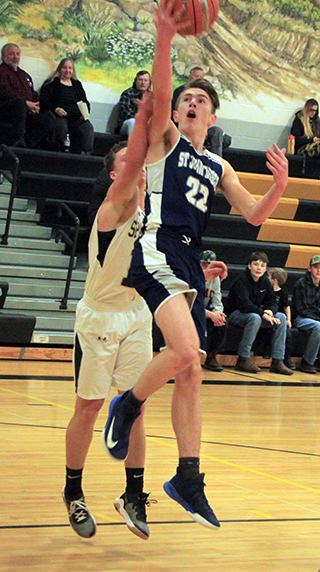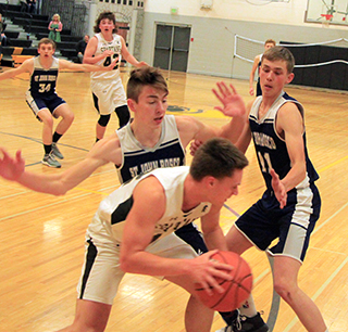 first quarter and the Patriots fought from behind the rest of the way.SJB was able to outscore Timberline in the second quarter 15-9 to cut the lead to 22-26 at the half. Timberline added 3 points back to the lead in the third quarter as they led 33-40 after 3 quarters. SJB was able to keep it close in the fourth but couldn’t overcome the deficit. Chmelik led the Patriots in scoring with 14 points while Cody Wassmuth scored 10. Weckman and Stubbers scored 8 each and Levi Wassmuth scored 6. The Patriots are 4-5 in league play with 1 game left against Highland, and 7-7 overall. St. John Bosco 7 15 11 13 -46 Timberline 17 9 14 11 -51 SJB-C. Wassmuth 3, 2-2, 10; Stubbers 4, 0-0, 8; Weckman 3, 1-2, 8; Chmelik 6, 0-0, 14; L. Wassmuth 3, 0-1, 6. 3-pointers-C. Wassmuth 2, Chmelik 2, Weckman. Timberline-Brown 6, 4-4, 18; Nelson 3, 0-3, 6; Hunter 3, 2-2, 8; West 4, 0-2, 8; G. Christopherson 4, 3-4, 11. 3-pointers-Brown 2. ![]() Clay Weckman with the ball at Timberline. ![]() Torry Chmelik and Cody Wassmuth doubleteam a Timberline ballhandler. Also shown is Levi Wassmuth, 34. ![]() Torry Chmelik goes for a lay-up at Timberline. NOVEMBER