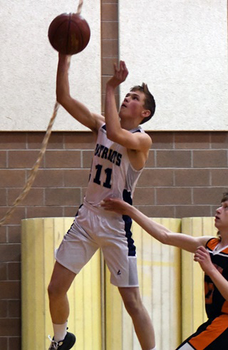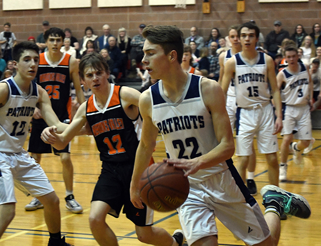 In their final home game of the season the Patriots beat Meadows Valley 48-37 in a game rescheduled from Jan. 21.The game was tied after the first quarter at 8-8 but the Patriots outscored the Mountaineers 13-8 in the second quarter to take a 21-16 halftime lead. Meadows Valley turned the tables in the third quarter, outscoring the Patriots 8-13 to tie the score at the end of the third at 29-29. The Patriots then dominated in the fourth quarter 19-8 to pull out the win. The Patriots apparently went to a press in the fourth and forced some steals that were converted into easy baskets. Cody Wassmuth had a perfect night shooting for the Patriots as he went 5 for 5 from the field and 4 for 4 at the line for 14 points. Torry Chmelik scored 11 points. Levi Wassmuth scored 10. Clay Weckman scored 4. Luke Stubbers, Elijah Rauzi, Dustin Kaschmitter and Sam Weckman scored 2 each and Stallone Hoene scored 1. For Rauzi and Sam Weckman it was their first points of their varsity careers. St. John Bosco 8 13 8 19 -48 Meadows Valley 8 8 13 9 -37 SJB-Rauzi 1, 0-0, 2; C. Wassmuth 5-, 4-4, 14; Stubbers 1, 0-0, 2; Hoene 0, 1-4, 1; C. Weckman 1, 1-2, 4; Chmelik 5, 0-1, 11; L. Wassmuth 5, 0-0, 10; Kaschmitter 1, 0-0, 2; S. Weckman 1, 0-2, 2. 3-pointers-C. Weckman, Chmelik. MV-J. Padgett 0, 0-0, 0; Priddy 4, 0-2, 11; Larrea 1, 0-1, 2; Gwinn 0, 0-0, 0; Jernigan 2, 1-4, 5; C. Padgett 5, 0-0, 13; Rivas 3, 0-0, 6. 3-pointers-C. Padgett 3, Priddy 3. At Highland