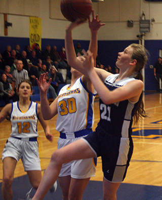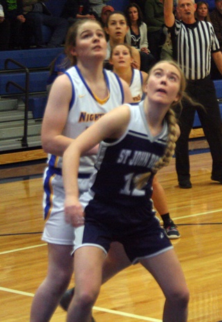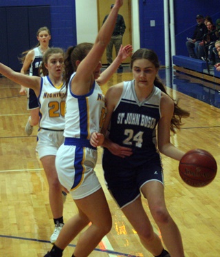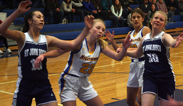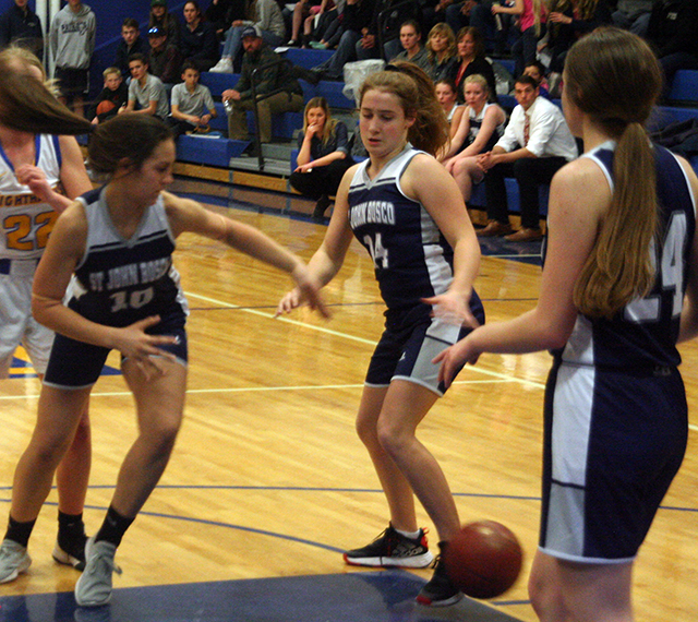 ST. JOHN BOSCO 2021-22 GIRLS AND BOYS BASKETBALL SCHEDULESThe St. John Bosco Lady Patriots closed out their season with a 29-37 loss at Nezperce Tuesday, Feb. 8, to finish in fourth place at the District Tournament. Nezperce jumped out to a 4-12 lead after one quarter then outscored the Patriots just 3-5 in the second quarter to take a 7-17 halftime lead. According to Steve Wherry of the Lewis County Herald, (who took the accompanying photos) the Patriots should have been way ahead in the first half. They dominated the action but just could not get their shots to fall. Nezperce outscored the Patriots 2-10 in the third quarter to take a 9-27 lead into the fourth and then had to hold off a Patriots’ rally. St. John Bosco outscored Nezperce 20-10 in the final period but it wasn’t enough to dig themselves out of the hole they built through the first 3 quarters. Jade Prigge scored 9 points to lead the Patriots with Julia Wassmuth scoring 8 and Sarah Waters 7. Dani Sonnen scored 3 and Raylie Warren scored 2. The Patriots finish their season with a 5-11 record. St. John Bosco 4 3 2 20 -29 Nezperce 12 5 10 10 -37 SJB-Prigge 4, 1-3, 9; D. Sonnen 1, 1-2, 3; Chmelik 0, 0-0, 0; Waters 1, 5-10, 7; Wassmuth 3, 2-2, 8; R. Sonnen 0, 0-0, 0; Warren 1, 0-2, 2. 3-pointers-none. Nezperce-G. Tiegs 0, 4-4, 4; Lux 3, 3-7, 10; Duuck 1, 0-1, 2; Zenner 7, 1-2, 17; Branson 2, 0-0, 4; Wemhoff 0, 0-0, 0; F. Tiegs 0, 0-2, 0; Horton 0, 0-0, 0. 3-pointers-Zenner 2, Lux. ![]() Jade Prigge with the ball against Nezperce at District. Also shown is Julia Wassmuth. Photo by Steve Wherry of the Lewis County Herald. ![]() Raylie Warren and Rachel Sonnen battle Nezperce for rebounding position. Photo by Steve Wherry of the Lewis County Herald. ![]() Dani Sonnen blocks out against a Nezperce player at District. Photo by Steve Wherry of the Lewis County Herald. ![]() Raylie Warren Sarah Waters and Jade Prigge about to go after a loose ball. Photo by Steve Wherry of the Lewis County Herald. ![]() Julia Wassmuth puts up a shot against Nezperce. Photo by Steve Wherry of the Lewis County Herald. Patriots win final 2 regular season games The St. John Bosco Patriots finished their regular season with a pair of wins. On Friday, Feb. 11 they played their final home game and beat Meadows Valley 48-37 in a game rescheduled from Jan. 21. On Monday, Feb. 14, they closed out their regular season with a 51-36 win over Highland at Craigmont. The win at Highland gained St. John Bosco a fourth place tie in the final league standings against Highland. However the Huskies have the tiebreaker and will be the #4 seed, hosting the Patriots this Friday, Feb. 18, at 6 p.m. in a loser out game. Vs. Meadows Valley