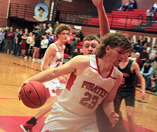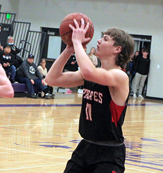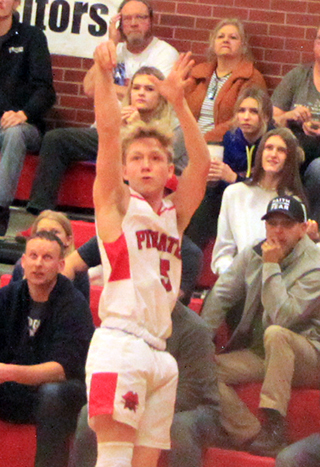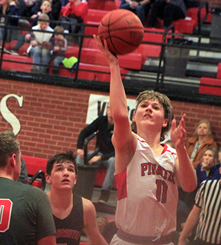 12 points total.Kamiah led early 0-2 and 2-4 then Prairie took their first lead with a 6-0 run. Schwartz scored on a runner. Ross scored a lay-up and Rambo drove in for a basket to make it 8-4. After a Kamiah basket, Schumacher sank a 3-pointer to make it 11-6. Kamiah cut the lead to 1 then Prairie ended the quarter with a baseline shot by Rambo and a lay-up by Hanson to make it 15-10. Kamiah outscored Prairie 2-7 over the first 4 minutes of the second quarter to tie the game at 17. Forsmann then scored his first basket since the Logos game on a putback that put Prairie back into the lead. Rambo added a basket and Schwartz scored after making a steal to give Prairie a 23-17 lead at the half. In the third quarter Kamiah scored the first 5 points to cut the lead quickly to just 1 point. Forsmann hit a pair of free throws to push the lead back to 3. After a Kamiah basket, Forsmann made the second of 2 free throws to make it 26-24. Kamiah tied it with 4:40 left in the third. Schumacher then gave the Pirates their final lead of the game on a lay-up with 4:13 left. Prairie scored just 7 points over the final 12 minutes of the game. Kamiah tied it with 2:47 left then took the lead for good on a 3 pointer by Kavan Mercer with 1:57 left. Forsmann scored inside to cut the deficit to 1 but another 3 by Mercer made it 30-34 at the end of the third quarter. Neither team scored in the fourth quarter until the 4:26 mark when Kamiah’s Luke Krogh converted a 3-point play. There was no scoring for more than 2 minutes before Forsmann made a free throw at the 2:07 mark. Schwartz then stole the inbounds pass and scored a lay-up to pull the Pirates within 4 at 33-37. Prairie didn’t score again until Forsmann scored a putback at the buzzer. In the meantime Kamiah scored 7 straight points. For the game Forsmann was the Pirates high scorer with 10 points. He scored 8 of Prairie’s 12 second half points. Rambo added 8, all in the first half. Schumacher scored 7, Schwartz 6 and Ross and Hanson 2 each. Prairie is now 16-6 on the season. Prairie 15 8 7 5 -35 Kamiah 10 7 17 10 -44 Prairie-Ross 1-2, 0-0, 2; Schwartz 3-10, 0-0, 6; Rambo 4-10, 0-0, 8; Schumacher 3-15, 0-0, 7; Hanson 1-2, 0-0, 2; Forsmann 3-3, 4-6, 10. 3-pointers-Schumacher. Kamiah-Krogh 4-11, 1-1, 9; Kludt 3-7, 0-2, 6; Skinner 2-6, 2-2, 8; Cox 5-8, 0-2, 10; Mercer 3-13, 3-4, 11; DeGroot 0-1, 0-0, 0. 3-pointers-Mercer 2, Skinner 2. ![]() ![]() Kyle Schwartz goes for 3 against C.V. ![]() Shane Hanson with the ball in the low post in the Pirates’ District opener against C.V. Also shown is Morgan Poxleitner. ![]() Lane Schumacher lines up for a shot against Kamiah at the Lewiston High School gym. ![]() Lee Forsmann returned to action against Kamiah. Here he goes after a loose ball. ![]() Zach Rambo shoots a jump shot against Kamiah.