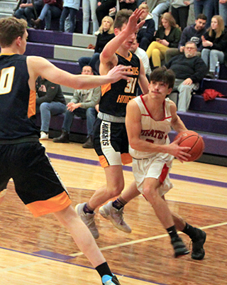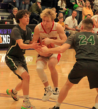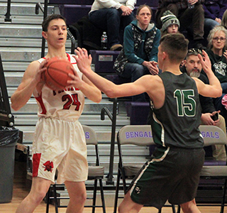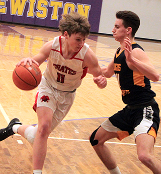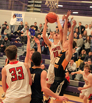 drive to the hoop at the 3:00 mark of the first quarter.Nuttbrock then scored 6 straight points for Logos to give them the lead for good. Schumacher hit a 3 late in the first quarter to cut the deficit to 8-11 at the end of the first quarter. Nuttbrock opened the second quarter with a 3 but Schumacher responded with a 3 of his own. Rambo made a free throw to cut the lead to 2 but another 3 by Nuttbrock made it 12-17. Rambo scored on a drive to the hoop but Logos answered with 5 straight points for a 14-22 lead with 1:15 left in the half. Schumacher made 4 straight free throws in the final 25 seconds of the half to make it 18-22 at the break. A free throw by Ross and a jumper from the elbow by Rambo cut the deficit to 1 at 21-22 early in the third quarter. After a basket by Logos, Schumacher made a 3 to tie the game at 24. Logos then scored 8 straight points to take the lead for good. Rambo broke the run with a 3 with 1:52 left in the third but Logos made a pair of free throws to take a 27-34 lead into the fourth quarter. Three times the Pirates were able to cut the lead to 6 in the fourth quarter but could get no closer as the Knights had an answer each time. The final 6 point margin came with 51 seconds left when Schumacher scored on a drive to make it 36-42. The Pirates had some opportunities after that but missed on several shots and that wound up as the final score. Schumacher scored 20 points to lead the Pirates. Rambo added 11 on a night where he missed a lot of shots he normally makes. Schwartz and Forsmann scored 2 each and Ross scored 1. Nuttbrock led the Knights with 24 points with no one else scoring more than 5. Prairie had a 44-31 edge on the boards led by Rambo with 12 and Forsmann with 11. Schumacher added 8 rebounds. Schumacher had 2 steals and Ross had 3 assists. Prairie was 11 for 53 from the field, 21%, and 9 for 14 at the line, 64%. Logos was 15 for 47 from the field, 32%, and 6 for 10 at the line, 60%. Prairie ends their season with a record of 17-7 Prairie 8 10 9 9 -36 Logos 11 11 12 8 -42 Prairie-Ross 0-4, 1-2, 1; Schwartz 1-4, 0-0, 2; Rambo 4-18, 2-4, 11; Schumacher 6-20, 4-4, 20; Forsmann 0-7, 2-4, 2; Hanson 0-0, 0-0, 0; Poxleitner 0-0, 0-0, 0. 3-pointers-Schumacher 3, Rambo. Logos-Nuttbrock 9-19, 1-1, 24; Wilson 1-5, 0-0, 2; Casebolt 2-11, 0-0, 4; Whitling 0-2, 0-1, 0; Driskill 0-4, 2-3, 2; Elmore 2-4, 0-2, 5; Druffel 1-2, 3-3, 5. 3-pointers-Nuttbrock 5, Elmore. ![]() ![]() Kyle Schwartz makes a jump stop between two Potlatch players at District. ![]() Colton McElroy with the ball in the Potlatch game. ![]() Matt Wemhoff puts up a 3-pont shot against Potlatch. ![]() Zach Rambo contorts his way to the hoop for a lay-up against Logos. Also shown are Lee Forsmann, left, and Shane Hanson, right. ![]() Lane Schumacher drives into the lane past a Logos defender. ![]() Wyatt Ross looks to shoot against Logos.