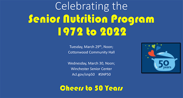 Senior Nutrition celebrates 50 years Since 1972, the national Senior Nutrition Program has supported nutrition services for older adults across the country. Funded by the Older Americans Act, local programs serve as hubs for older adults to access nutritious meals and other vital services that strengthen social connections and promote health and well-being. Prairie Mountain Nutrition will be serving a special lunch and cupcakes at noon on Tuesday March 29 at the Senior Lunch site in the lower level of Cottonwood Community Hall and on Wednesday, March 30 at the Winchester Senior Center. ![]()