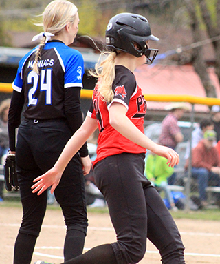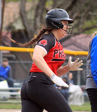 to field conditions in Cottonwood.In the opening game against Potlatch Prairie was able to muster only 2 hits against Potlatch pitcher Rebecca Butterfield, a single each by Key and Schlader. Potlatch meanwhile had 8 hits including a triple and took advantage of 5 Prairie errors to score 9 runs in the first and 6 more in the second and end the game after 3 innings on the 15-run mercy rule. Prairie 0 0 0— 0 2 5 Potlatch 9 6 0—15 8 0 Game 2 vs Potlatch