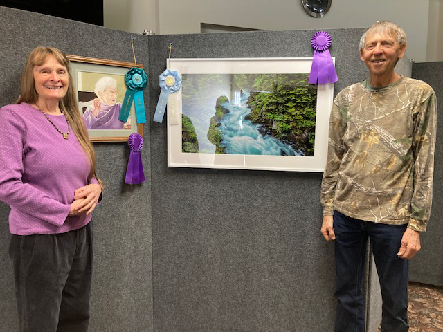 First Place awards Liz Clark presented for Fine Arts were to: Carrie Jo Rehfeld for her oil, “Sandpiper Reflection”; Doug Boomer for his acrylic, “Bales of Hay”; Jackie Zumalt for her watercolor, “Stand-Up”; Debra Barnett for her mixed media, “Elk Herd”. Ms. Clark presented second place awards to: Carrie Jo Rehfeld for her oil, “Cottonwood Butte”; Leah Harvey for her acrylic, “Hunting Along the Snake”; Suzie Barnett for her watercolor, “The New Girl”; Joy Perkins for her mixed media, “Looking Back”. Third place awards Ms. Clark presented to: Doug boomer for his oil, “Bear Claw” and for his acrylic, “Mustangs”; Suzie Barnett for her watercolor, “Day Gone By”; Kathryn Van Acker for her mixed media, “Geological”. An Honorable Mention awards for watercolor paintings were given to Stephanie Merrill for “Mustang” and to Pearl Maxner for “My Jewel”. The Gallery Award went to Pearl Maxner for her watercolor, “Ready for Show”. People’s Choice and Kid’s Choice awards went to David Martin for his “Wild Blues”. The second Kid’s Choice award went to Sharon Dunlap for “The Contender”. Winner of the Raffle for Lola’s Phar’s original oil of “White Bird” was Ellamae Holes. Kristy DeYoung awarded Photography ribbons: First and second place to David Martin for his “Stars and Stripes” and “After the Storm”, respectively. Third place awards went to Marlene ONeill for her “O’Neill Sunset”, and to Sam Perkins for his “Looking Ahead”. CIAA thanks the Idaho County Free Press, the Clearwater Progress, the Cottonwood Chronicle, the Clearwater Tribune, the Lewis County Herald and the Grangeville Board (on courthouse lawn) who promoted the show; it thanks the judges who gave the show value, the artists and artist workers who put up the show and all supporters who celebrated and made it a part of our community!! Thank you! ![]() David Martin, right, was judged Best of Show in the photography division at the CIAA Spring Show. Pearl Maxner, left was judged best of show for her watercolor painting. Photo provided by Marlene O’Neill.