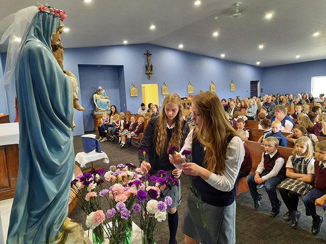 Chmelik, presenting their flowers to Mary as the rest of the student