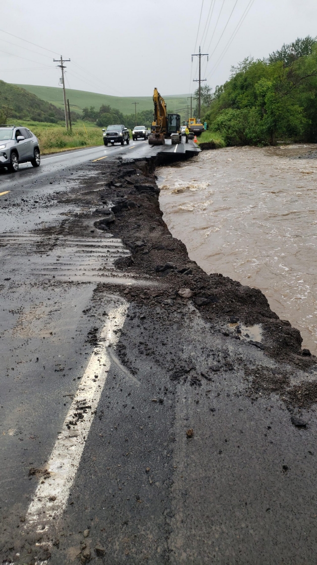| Flooding closes 1 lane of US 95 south of Lapwai Monday morning, the Idaho Transportation Department closed one lane of U.S. Highway 95 four miles south of Lapwai at milepost 296 due to flooding. “Flooding of Lapwai Creek has washed away the shoulder next to the northbound lane and may be undermining the highway,” Operations Engineer Jared Hopkins said. "Closing that portion of the roadway is necessary to ensure safety." One lane of U.S. Highway 95 remained closed south of Lapwai at milepost 296 due to flood damage on Tuesday, June 14. “With floodwaters receding and drier days in the forecast, we feel we are past the emergency,” Operations Engineer Jared Hopkins said. “Yesterday, (Monday) we rushed to get an excavator on scene to start placing large boulders against the bank to save what remained of the northbound lane of US-95. In one spot, it had washed away to the center.” Crews aim to finish placing rock and reopen both lanes of the highway by the end of the week. “We are working hard to have two lanes open with an asphalt surface as soon as we can,” Hopkins said. “Then we’ll start focusing on more permanent repairs later this summer.” Water over the roadway has also been reported on State Highway 6 between Potlatch and Deary. Before traveling drivers should check conditions on their routes at 511.idaho.gov. ![]() US 95 south of Lapwai had part of the roadway washed out by Lapwai Creek during high water. The ITD brought in the excavator Monday to place large rocks to try and save the roadway. By Wednesday, June 15, they had the road repaired and both lanes opened.. ITD photo.
