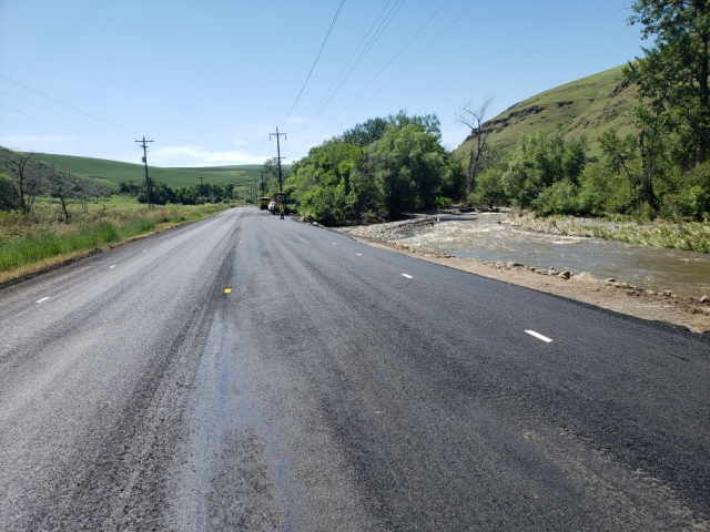 | Flood damage repaired on US 95 south of Lapwai Both lanes of U.S. Highway 95 south of Lapwai at milepost 296 have been reopened following repairs to damage caused by flooding last week. Floodwaters from Lapwai Creek first began eroding the northbound lane on Monday morning, and the Idaho Transportation Department reduced traffic to one lane. Repairs began later that day, with crews bringing in rock to replace what was lost and prevent further damage. “We are happy to return US-95 to normal condition,” Operations Engineer Jared Hopkins said. Traffic impacts and highway conditions are available 24/7 on 511.idaho.gov. ![]() What it looked like last Monday, June 13. ![]() After the washed out area had been rebuilt late last week. Photos by ITD.