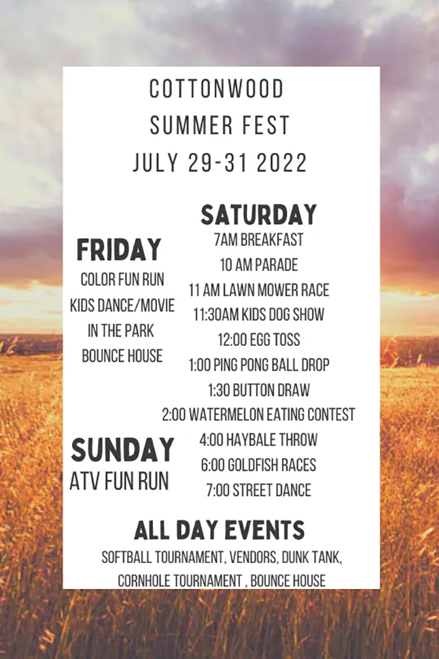 The annual Cottonwood Summer Fest Celebration is set for July 29-31. Above is a schedule of events. Click on the photo for a
