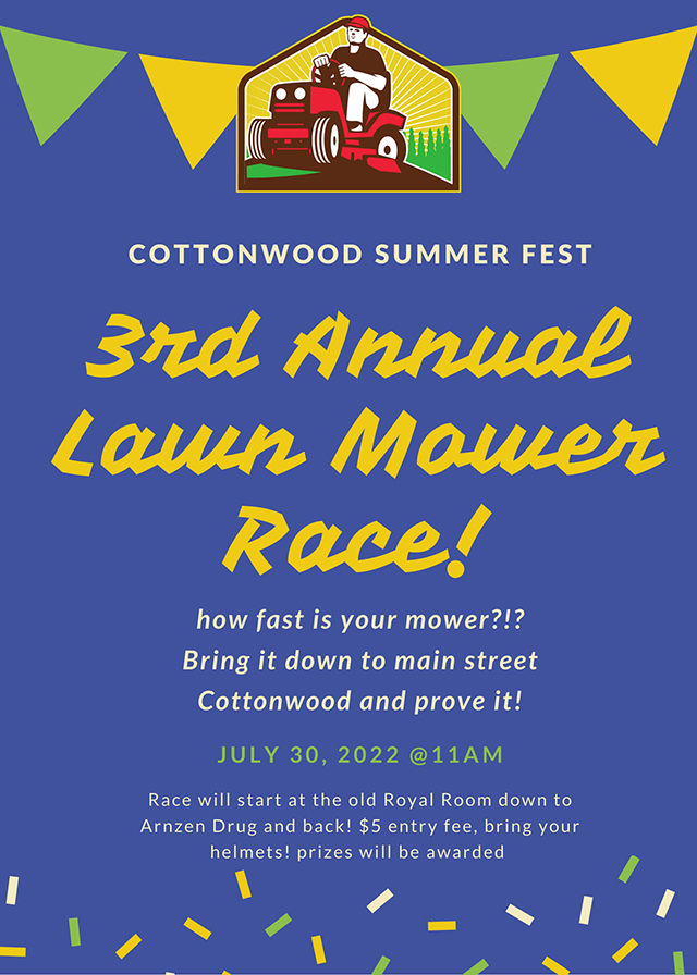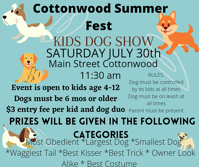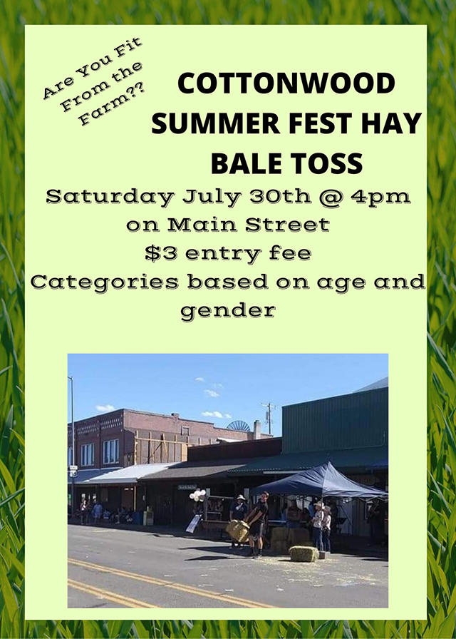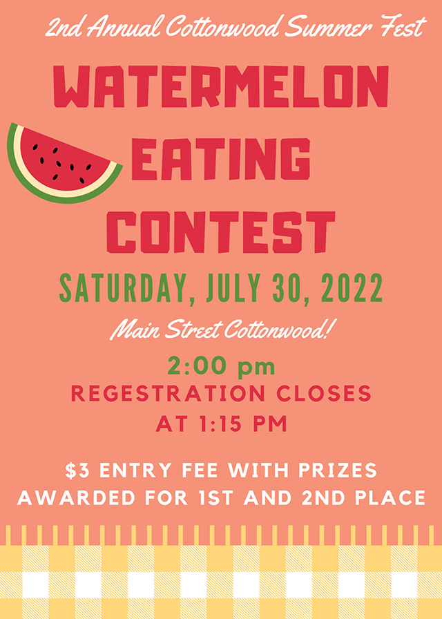 | Summer Fest is this weekend The third Cottonwood Summer Fest celebration is this weekend. The event starts on Friday evening with events at the Cottonwood City Park. The Color Fun Run/Walk set to start at 5:30 p.m. Friday has been cancelled due to concerns about the extreme heat leading to minimal signups. At the Park on Friday will be a Kids Dance and movie plus a bounce house. The movie this year is “The Karate Kid.” Saturday is the main day for the festival and things get started at 7 a.m. with a breakfast at C’est La V’s. The following events are all taking place on Main Street. The Summer Fest Parade is set to start at 10 a.m. The Lawn Mower Race is set for 11 a.m. The Kids Dog Show follows at 11:30 a.m. The Egg Toss will start at noon. The Ping Pong Ball drop will be at 1 p.m. The button drawing will be held at 1:30 p.m. The Watermelon Eating Contest will take place at 2 p.m. At 4 p.m. is the Hay Bale Throwing contest. At 6 p.m. are the Goldfish Races. At 7 p.m. is the Street Dance featuring “American Bonfire.” Also taking place on Main Street throughout the day will be a Cornhole Tournament. Food and crafts vendors will also be located on Main Street as well as a Bounce House. A co-ed softball tournament will be held at the Wimer Ballfields. The only event scheduled for Sunday is an ATV Fun Run which will start at An American Bar on Main Street at about 11 a.m. See below for event flyers. ![]() ![]() ![]() ![]() ![]() ![]() ![]() |