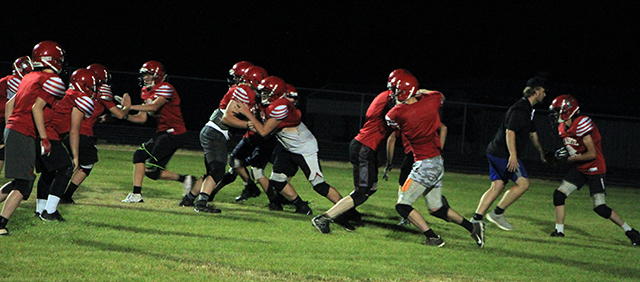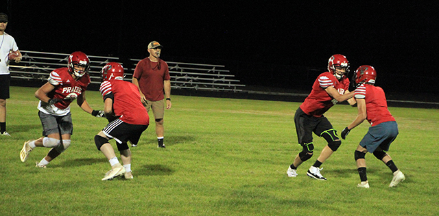 The Prairie Pirates will be involved in a football jamboree this Friday, August 19 at Clearwater Valley High School in Kooskia. The Admission prices are Adults $5 and Students $3. IHSAA cards will not be honored as the jamboree is ONLY allowed as a fund-raising event for Youth Endowment Association. This will be a controlled scrimmage with no kickoffs or punts. Coaches will be allowed to stand behind their respective huddles. Each team is allowed to be on offense and defense against the other schools with a 15-minute running clock for each segment. The team on offense starts on its own 40-yard line and keeps the ball for the full 15 minutes. If they fail to make a first down, the ball is brought back to the 40, where they start again. If there is a turn-over, the ball goes back to the offense, once again starting on its own 40. The first round will start at 7 p.m. and will feature C.V. vs. Timberline and Prairie vs. Lapwai. The second round will have C.V. vs. Lapwai and Prairie vs. Timberline. The third and final round will have C.V. vs. Prairie and Lapwai vs. Timberline. We will take a 10 minute break in between each Round. It is a running clock and there are no timeouts. There will be concessions available. ![]() New head coach T.T. Cain watches as he puts his players through a douwnfield blocking drill. At left in the white shirt is returning assistant coach Tanner Ross. ![]() Another shot of the downfield blocking drill. ![]() New assistant coach Hayden Uhlenkott stands in a quarterback for a drill on line play. ![]() After the snap on a similar play. PIRATES FOOTBALL SCHEDULE FOR 2022 AUGUST