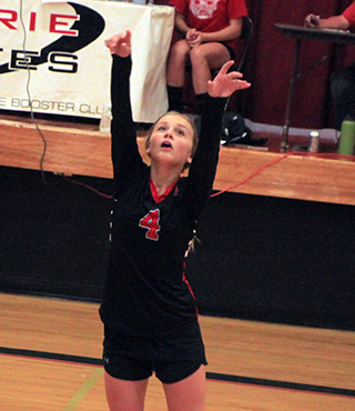 Lady Pirates fall in 5 games to Logos The Prairie Lady Pirates lost a 5-set league match to Logos last Thursday, Sept. 1 at Cottonwood. Scores were 15-25, 16-25, 25-22, 25-23, 11-15. Prairie struggled against the Knights in the first two games as they fell behind 0-4 in the opener and trailed throughout on the way to a 10-point loss. ![]() The second game started better as Tara Schlader scored a kill to open the game and Lexi Schumacher served 2 aces for a 3-0 lead. Logos came back to take a 6-7 lead. Kristin Wemhoff tied it with a back row kill then Logos took the lead for good and eventually won by 9. It looked like it might be a 3-game sweep when Prairie fell behind 3-8 and 5-10 in the third game. A kill by Alli Geis and 4 aces by Julia Rehder wiped out the deficit as the score was tied at 10-10. Prairie took their first lead since it was 1-0 at 14-13 on an ace by Schumacher. The lead changed hands a couple time until a free ball kill by Rehder tied it and then Rehder scored another kill for an 18-17 lead. Riley Enneking added 2 aces to make it 20-17. Prairie never trailed again in the game although Logos got within 1 at 23-22. At that point the Knights missed a serve and Schumacher followed with an ace for the game winner. The fourth game saw Prairie lead at 8-7 after two aces by Geis and again at 10-9 after an ace by Schumacher. Otherwise they trailed until Schlader went to the service line after Wemhoff scored a sideout kill to make it 11-13. Enneking scored a kill followed by 2 aces by Schlader that put Prairie ahead 14-13. A kill by Rehder was followed by 3 more acres as Schlader completed a 7-point service run for an 18-13 Pirate lead. The Pirates were able to hold off the Knights and got to 24-20 on a missed Logos serve. Logos fought off 3 game point chances before a kill by Schlader scored the game-winner. In the deciding fifth game Logos held the lead much of the game. Prairie led at 2-1 after a kill by Schumacher but didn’t lead again until Schlader scored a kill to make it 8-7. After trading sideouts, Schlader scored a kill to make it 10-8. A net violation scored a sideout and then a Logos serve that Prairie thought was out but was called in, tied the game at 10-10. Logos added 3 more serving points for a 10-12 lead. Schlader scored a sideout kill but then missed a serve and Logos was able to serve out the match. Schlader had 15 kills, 2 assists and 6 aces in the match. Rehder had 13 kills, 2 assists and 5 aces. Wemhoff had 8 kills, 4 assists and 2 aces. Geis had 7 kills including 2 blocks and 4 aces. Schumacher had 3 kills, 33 assists and 6 aces. Enneking had 3 kills, 3 assists and 3 aces. Taylor Riener had 2 kills and 2 assists. Prairie is now 2-1 in best of 5 matches and 1-1 in league play. The JV team won all three of their games against Logos and you couldn’t find two games much different than the final two as they won 25-23, 32-30 and 15-0. In the opener Logos scored the first point then Prairie took the lead with a 6-0 run as Kaylie Lockett served 4 aces and Kylie Schumacher added a kill. Logos got back within 2 at 7-5 then Sydney Shears served 4 straight points for a 12-5 lead. She had 2 aces and Ashlyn North added a kill. Logos was able to cut into the lead and finally tied the score at 20. A kill by North put Prairie back on top then she served an ace and Tamden Pecarovich added a free-ball winner to make it 23-20. A missed serve put Prairie at game point but Logos twice fought it off to pull within 24-23 before Pecarovich scored the game winning kill. Pecarovich served 2 aces to help Prairie take a 3-0 lead in the second game. Logos came back to take a 10-11 lead before Kylie Schumacher scored a sideout kill. Sierra Oliver then served Prairie to a 17-11 lead with 2 aces plus kills by Hailey Hanson and Ember Martin. After 2 aces by Martin, Prairie led 21-13 and it looked like they had the game in hand. Logos came roaring back to cut the lead to 23-20. A free ball kill by Martin put Prairie at match point at 24-20. After a missed served and 4 straight Logos points, the Knights had a game point opportunity at 24-25. A kill by Schumacher staved off that game point and a kill by Martin staved off one at 25-26. An ace by Oliver gave Prairie another match point chance. Logos answered with 2 straight points for what turned out to be their final game point chance at 27-28. Prairie had match point chances at 29-28 after an ace by Pecarovich and at 30-29 after a kill by Pecarovich. Each team then missed a serve to give Prairie one more match point chance at 31-20 and Schumacher came through with the match-winning kill. Logos was obviously deflated in the third game as Lockett scored a sideout kill to open the game and then Pecarovich served 14 straight points for a shutout win. She had 7 aces while Schumacher and Lockett each had 3 kills and Shears scored the other kill. ![]() Tara Schlader with a jump serve early in the match. ![]() Lexi Schumacher sets the ball. ![]() Riley Enneking with a jump serve. ![]() Alli Geis puts the ball over the net. Also shown is Lexi Schumacher. PIRATES VOLLEYBALL SCHEDULE FOR 2022