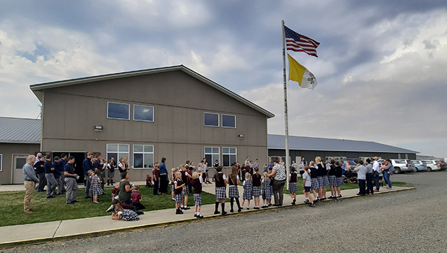 Some of the Elementary students and their parents that joined the Homecoming Parade at the Catholic Church. Click on