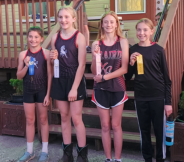 The Prairie Cross Country team traveled to Potlatch last Tuesday, Oct. 4, for the Potlatch Invitational. PIRATES CROSSCOUNTRY SCHEDULE FOR 2022In the high school boys race Prairie was missing the usual top 3 finishers with Morgan Poxleitner placing 36th in 23:30.69. Zane Uptmor was 45th in 25:17.21. Dylan Klapprich was 49th in 26:34.34 and Landon Riener was 54th in 31:12.08. However, with the Grangeville runners they placed 6th as a team. Simeon Sanchez was third in 19:27.84. Gabe Bybee was 19th in 22:03.67, Parker Farmer was 42nd in 24:37.97 and Ayden Arnett was 44th in 25:09.11. In the high school girls race Prairie had just 3 runners as Elizabeth Severns placed 19th in 27:41.45. Alaina Lustig was 24th in 30:27.08 and Miranda Klapprich was 30th in 34:26.94. Natalie Goeckner and Callie Remacle were unable to attend. Two Grangeville girls running as Prairie enable Prairie to finish 3rd as a team. Kacee Evans was 12th in 25:46.29 and Kassi Miller was 20th in 27:43.91. The junior high girls placed 2nd as a team with both Evelyn Gehring and Aubree Geis earning medals. Gehring was 4th in 14:34.98 and Geis was 5th in 14:36.09. Avery Kehler was 13th in 15:52.42. Olivia Uhlenkott was 16th in 17:32.05 and Alaina Decaria was 23rd in 20:04.42. Matthew Jones was Prairie’s top finisher in the junior high boys race as he placed 17th in 14:32.47. Kade Hanson was 22nd in 16:07.98. Gabe Decaria was 26th in 17:46.41 and George Villamor was 28th in 19:01.33. ![]() At right are Evelyn Gehring and Aubree Geis with their 4th and 5th place ribbons at the Potlatch Invitational. Photo by Dave Young. ![]() Morgan Poxleitner at the Potlatch Invitational. ![]() Zane Uptmor at the Potlatch Invitational. ![]() Dylan Klapprich at the Potlatch Invitational. ![]() Olivia Uhlenkott in the girls junior high race at Potlatch. Above 4 photos by Glenn Poxleitner. OCTOBER 19-District Meet at Lewiston, girls race at 2 p.m., boys race at 2:45 p.m.