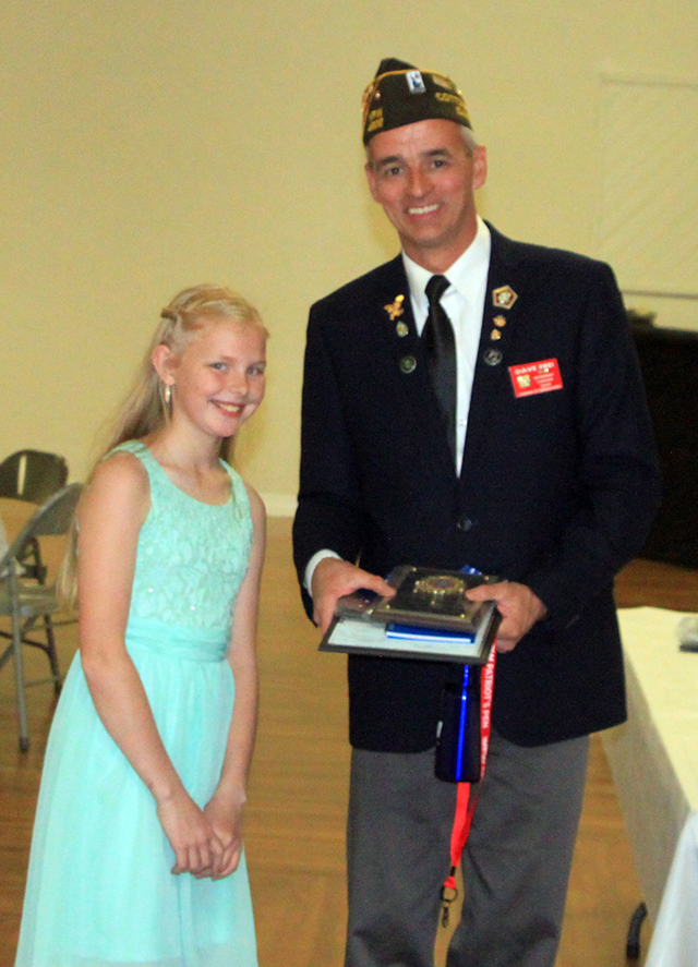 4902's Voice of Democracy competition. She receives the awards from Joe