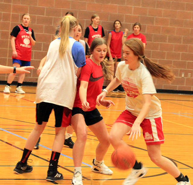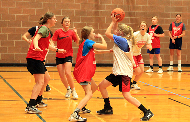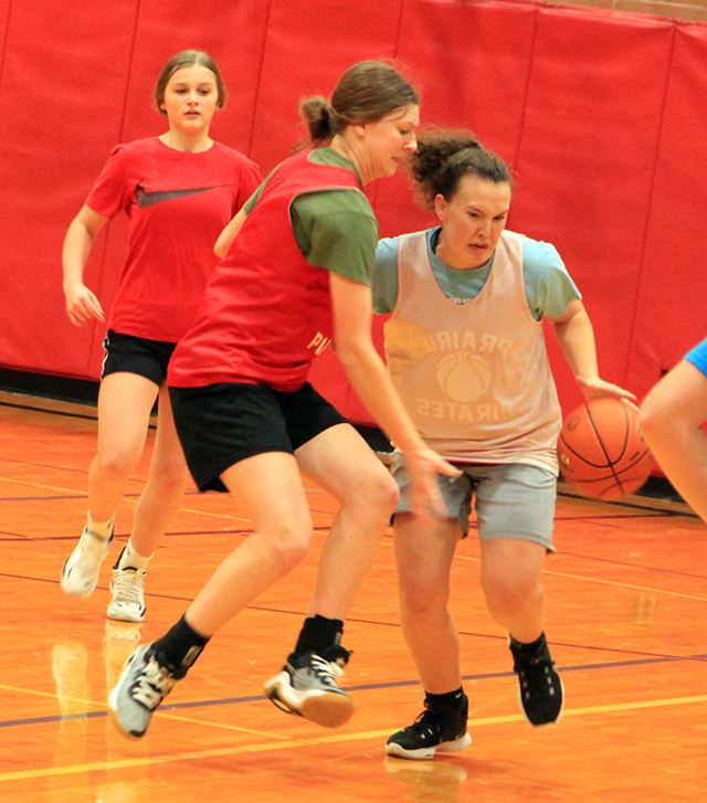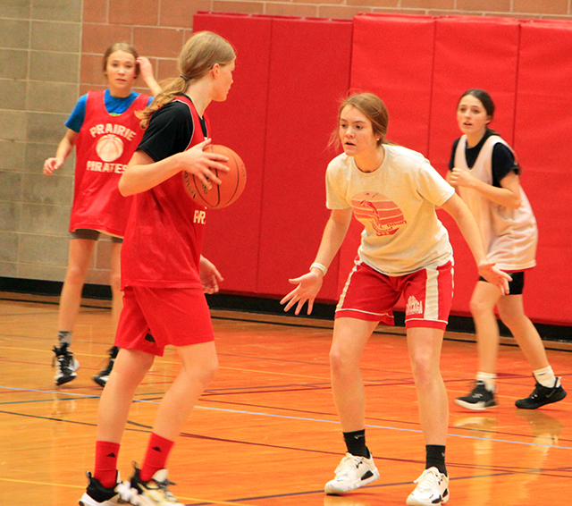 17 turn out for PHS girls basketball Prairie has 17 players turned out for high school girls basketball this season. Returning starters are seniors Kristin Wemhoff and Tara Schlader. Also returning from last year’s varsity team are senior Riley Enneking, junior Alli Geis and sophomore Lexi Schumacher. New to the varsity team this year are freshmen Hailey Hanson and Kylie Schumacher and swing players, sophomore Kaylie Lockett and freshmen Sydney Shears and Sage Elven. Making up the JV team are juniors Elizabeth Severns and Sarah Lustig, sophomores Lockett, Kadence Kalmbach, Ellie Nuxoll and Aubree Rehder and freshmen Shears, Elven, Avery Riener and Callie Remacle. Lori Mader returns for her 13th season as head coach and welcomes new assistant coach Daphne Hanson. Lapwai will again be the team to beat in the White Pine League and coach Mader expects Genesee to be a contender along with possibly Potlatch and Kamiah. This year two teams will advance out of District to the State Tournament. ![]() Sarah Lustig with the ball during a scrimmage is guarded by Avery Riener. Also shown on the court are Kylie Schumacher, Lexi Schumacher and Tara Schlader. Watching from the sidelines are Kristin Wemhoff and Elizabeth Severns. ![]() Kylie Schumacher blocks Tara Schlader's shot. Also shown are Avery Riener and Sarah Lustig. ![]() Riley Enneking made this shot from the elbow. ![]() Sage Elven is guarded by Tara Schlader. Also shown are Avery Riener and Aubree Rehder. ![]() Sarah Lustig sets a pick on Lexi Schumacher as Tara Schlader dribbles past. ![]() Kylie Schumacher guards Kaylie Lockett. Also shown is Lexi Schumacher. PIRATES GIRLS BASKETBALL SCHEDULE FOR 2022-23 *indicates league game NOVEMBER