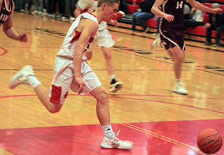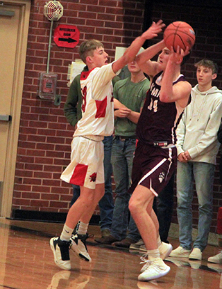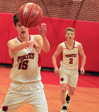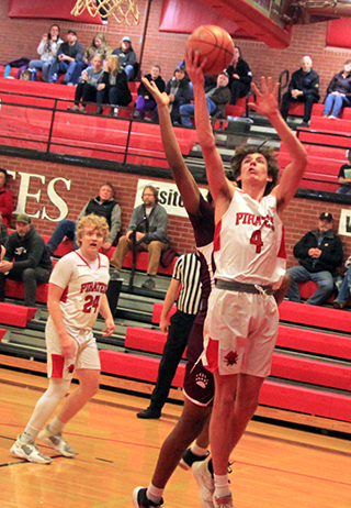 The Prairie Pirates were missing a couple of starters due to illness and lost a league matchup to Kamiah 26-55 at Cottonwood Tuesday, Dec. 13. They were also to play at Potlatch on Friday, Dec. 16, but that game was cancelled due to more illnesses on the team.Shane Wemhoff and Trenton Lorentz were both missing due to illness with Bennie Elven and Noah Behler replacing them in the starting lineup. Prairie took a quick lead in the game when Matt Wemhoff sank a 3-pointer from the corner off a feed from Elven. Kamiah answered with 5 straight points to take their first lead but Lee Forsmann stole the ball and drove the length of the court for a lay-up to tie the game at 5-5. After a Kamiah free throw, Behler scored off a feed from Wemhoff to give Prairie a 7-6 lead at the end of the first quarter. Kamiah took the lead for good on a basket to start the second quarter. Forsmann then picked up his third foul and sat the rest of the half as Kamiah dominated the rest of the quarter. Kamiah had a 0-10 run to start the quarter before Behler scored with 4:07 left. Kamiah then scored 5 straight for a 9-21 lead. Prairie put a bit of a rally together as Riley Shears made a free throw, Levi Gehring scored after a steal and another steal by Gehring led to a basket by Elven that cut the deficit to 14-21. Kamiah then closed out the half with a pair of baskets to take a 14-25 lead at the break. The Kubs then scored the first 9 points of the third quarter to take a 14-34 lead before Phil Schwartz connected on a 3-pointer with 3:30 left. Kamiah then scored another 5 straight before Forsmann scored his first points since the first quarter. Forsmann added another basket a minute later but Prairie trailed 21-43 after 3 quarters. Kamiah scored the first 6 points of the fourth quarter before Behler scored on a putback. Schwartz added a basket and Logan Weber a free throw for Prairie’s final points in a 29 point loss. Forsmann and Behler each scored 6 points to lead the Pirates in scoring. Schwartz added 5 with Wemhoff scoring 3. Elven and Gehring scored 2 each and Shears and Weber scored 1 each. Kamiah had a 16-34 advantage on the boards. Behler led the Pirates with 4 rebounds. Gehring and Forsmann each had 2 steals and Wemhoff had 3 assists. Prairie was 11 for 36 from the field, 31%, and 2 for 7 at the line, 29%. Kamiah was 23 for 45 from the field, 51%, and 8 for 14 at the line, 57%. Prairie is now 1-4 on the season and 0-3 in league play. Kamiah won the JV game thanks to a big fourth quarter, 27-33. Kamiah scored first in the game with a free throw but Prairie took their first lead on a 3-pointer by Phil Schwartz. Kamiah then scored 5 straight points before Logan Weber broke the run with a tip-in at the buzzer that made it 5-6 at the end of the first quarter. Nate Forsmann scored a pair of baskets to give Prairie a 9-6 lead in the second quarter. After a Kamiah basket, Forsmann scored again to make it 11-8. Kamiah then scored to cut the lead to 11-10 at the half. Forsmann opened the second half scoring then Kamiah got a pair of 3-points to retake the lead. Forsmann scored again to cut the lead to 1 but another 3 gave Kamiah a 15-19 lead. Kaden Duclos scored on a putback and was fouled. He completed the 3-point play to make it 18-19 at the end of the third quarter. In the fourth quarter Kamiah put in a swing player that later started in the varsity game. He scored 7 points and had 7 rebounds in the fourth quarter and contributed hugely to their win. Forsmann sank a 3-pointer to open the fourth quarter scoring and put Prairie into the lead. After Kamiah’s Jack Engledow made his fourth straight 3-pointer (he had scored all 9 of their third quarter points on 3’s), Briggs Rambo tied the game with a free throw. That’s when the varsity starter helped Kamiah take control as he scored 5 of Kamiah’s next 7 points as the Kubs took a 22-29 lead. Prairie got no closer than 5, at 26-31, the rest of the way. Forsmann wound up with 13 points and 7 rebounds to lead the JV’s in scoring. Duclos, Schwartz, Weber and Rambo each scored 3 and Ben Secrest scored 2. Kamiah had a 30-31 edge on the boards. Forsmann and Duclos each had 2 steals and Levi Gehring had 3 assists. The JV’s were 10 for 29 from the field, 34%, and 5 for 18 at the line, 28%. Kamiah was 13 for 42 from the field, 31%, and 3 for 13 at the line, 23%. Prairie also lost a C game against Lewiston by a score of 24-46. Prairie 7 7 7 5 -26 Kamiah 6 19 18 12 -55 Prairie-M. Wemhoff 1-6, 0-2, 3; Shears 0-6, 1-2, 1; Elven 1-2, 0-0, 2; Behler 3-7, 0-0, 6; Forsmann 3-7, 0-1, 6; Schwartz 2-5, 0-0, 5; Gehring 1-2, 0-0, 2; Rambo 0-0, 0-0, 0; Weber 0-0, 1-2, 1; R. Wemhoff 0-1, 0-0, 0. 3-pointers-M. Wemhoff, Schwartz. Kamiah-Kludt 7-13, 3-7, 17; Skinner 1-6, 0-0, 2; Koa 7-8, 1-1, 15; W. Millage 2-4, 1-2, 5; DeGroot 5-9, 1-2, 11; Loughran 1-4, 0-0, 3; Crowe 0-1, 2-2, 2; Q. Millage 0-0, 0-0, 0; Cereghino 0-0, 0-0, 0; Oatman 0-0, 0-0, 0. 3-pointers-Loughran. ![]() Bennie Elven makes a pass against Kamiah. Also shown is Matt Wemhoff. ![]() Phil Schwartz plays defense against Kamiah's David Kludt. ![]() Levi Gehring chases down a loose ball. ![]() Riley Shears shoots a lay-up. Also shown is Noah Behler. *indicates league game NOVEMBER
