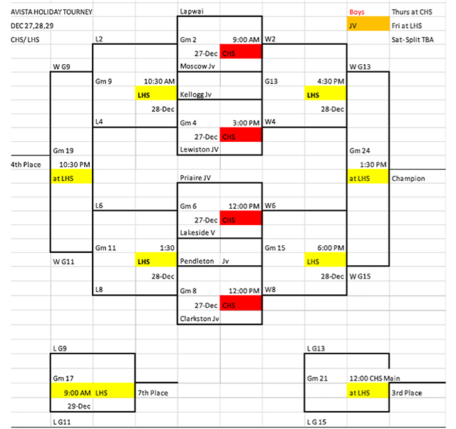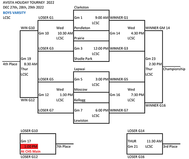 If the boys win they will play the Clarkston-Pendleton winner at 4:30 p.m. on Wednesday, Dec. 28. If they lose they will play the Clarkston-Pendleton loser at 10:30 a.m. on Wednesday.
