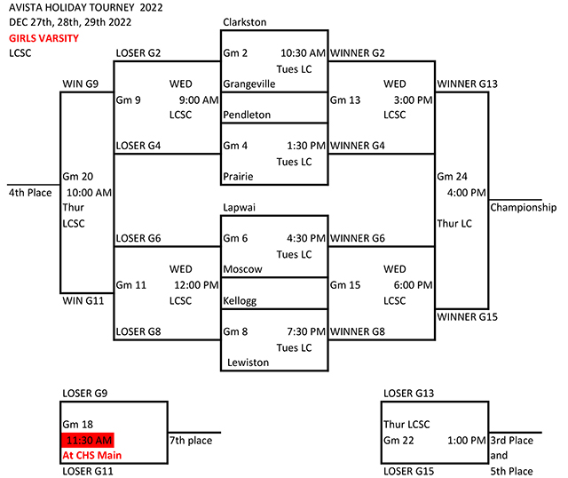 If the girls win they would play the Clarkston-Grangeville winner on Wednesday at 3 p.m. If they lose they would play the Clarkston-Grangeville loser at 9 a.m. on Wednesday.