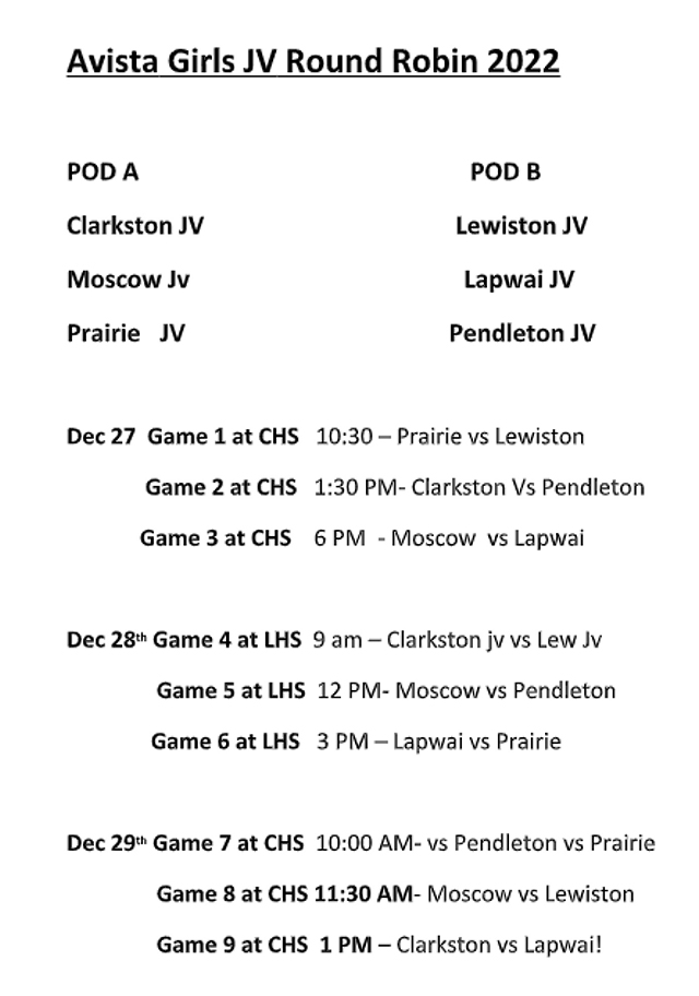 The JV girls will play Lewiston at 10:30 a.m. Tuesday at Clarkston High School. On Wednesday they will play Lapwai at 6 p.m. at Lewiston High School. On Thursday they will play Pendleton at 10 a.m. at Clarkston High School.
