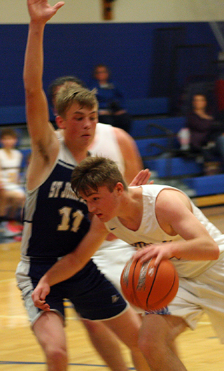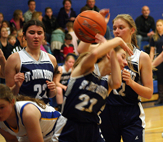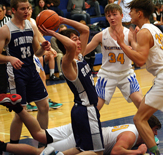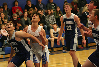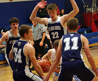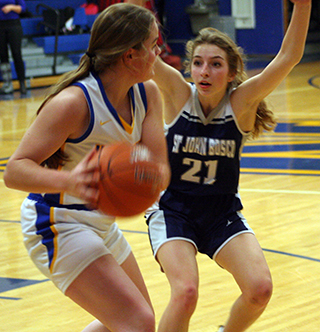 Patriot teams split at Nezperce UPDATED ST. JOHN BOSCO GIRLS & BOYS BASKETBALL SCHEDULE FOR 2022-23The St. John Bosco boys won a league game at Nezperce 68-41 while the girls lost their game 23-35 Tuesday, Dec. 13. Boys at Nezperce The boys team jumped out to a 13-7 lead by the end of the first quarter and led 36-19 at the half.Each team scored 13 in the third quarter then the Patriots pulled away in the fourth by outscoring the Nighthawks 19-9. Cody Wassmuth led the Patriots in scoring with 22 points and Clay Weckman almost matched him with 21 points. They both came up big as the Patriots pulled away in the fourth quarter. Also in double figures was Levi Wassmuth with 10 points. While Luke Stubbers, Stallone Hoene and Torry Chmelik each scored 4 and Matthew Warren scored 3. The Patriots improved to 4-1 overall and 3-1 in league play. The JV boys also won by a score of 24-15. SJB 13 23 13 19 -68 Nezperce 7 12 13 9 -41 SJB-C. Wassmuth 9, 3-4, 22; Stubbers 2, 0-0, 4; Hoene 2, 0-0, 4; Weckman 9, 2-6, 21; Chmelik 2, 0-0, 4; Warren 1, 0-0, 3; L. Wassmuth 5, 0-4, 10; Uhlenkott 0, 0-0, 0. 3-pointers-C. Wassmuth, Weckman, Warren. Nezperce-Johnson 3, 0-0, 6; Kirkland 2, 0-0, 4; Tiegs 3, 6-9, 13; McLeod 4, 1-2, 10; Williams 1, 1-1, 4; Wilcox 1, 1-2, 4; Dove 0, 0-0, 0. 3-pointers-McLeod, Williams, Wilcox. Girls at Nezperce The Lady Patriots fell behind 3-10 by the end of the first quarter at Nezperce and 7-15 at the half.They outscored Nezperce 14-12 in the third quarter to make it 21-27 after 3 quarters but could score only 2 points in the fourth. Julia Wassmuth led the scoring with 11 points with Sarah Waters scoring 6. Serinah Palmer, Maleah Cummings and Noelle Chmelik each scored 2. The Patriots drop to 1-5 on the season and 0-2 in league play. SJB 3 4 14 2 -23 Nezperce 10 5 12 8 -35 SJB-Wassmuth 5, 1-3, 11; Uhlenkott 0, 0-0, 0; Palmer 1, 0-2, 2; Cummings 1, 0-0, 2; Waters 2, 1-4, 6; Chmelik 1, 0-2, 2; Sonnen 0, 0-2, 0. 3-pointers-Waters. Nezperce-Tiegs 6, 0-0, 12; Lux 1, 0-0, 2; K. Duuck 0, 2-4, 2; Branson 1, 0-0, 2; Mattson 0, 0-0, 0; Zenner 3, 0-0, 6; E. Duuck 0, 0-0, 0; Wemhoff 4, 3-4, 11; Horton 0, 0-0, 0. 3-pointers-none. ![]() 4 Patriots surround a Nezperce player. From left are Clay Weckman, Levi Wassmtuh, Tory Chmelik and Cody Wassmuth. ![]() Cody Wassmuth plays defense at Nezperce. ![]() Matthew Warren, Tory Chmelik and Levi Wassmuth vie for rebounding position. ![]() Stallone Hoene comes up with a loose ball. Also shown is Levi Wassmuth. ![]() Maleah Cummings plays defense at Nezperce. ![]() Sarah Waters handles the ball at Nezperce. ![]() Serinah Palmer chases down a loose ball. ![]() Maleah Cummings ducks away from the ball. Also shown are Serinah Palmer and Julia Wassmuth. Photos by Steve Wherry of the Lewis County Herald. Boys team has JV, girls don’t NovemberFirst game starts at 6 p.m. unless indicated. Home games are played at Highland High School in Craigmont. 12-Girls vs. Cascade at Highland, 5 p.m, lost 24-34 December 17-Girls at C.V. 1-Boys at Meadows Valley, 5 p.m., V only January2-Girls vs. C.V. at Highland 6-Boys and Girls at Kendrick 4:30 p.m., Boys JV/V, Girls V 8-Boys at Timberline, JV/V 10-Girls vs. North Star Charter at Timberline of Boise, 4:45 MST 13-Boys and Girls at Nezperce, V only 15-JV Boys vs. Clarkston C at Highland, 6 p.m. no info available 15-Girls vs. Clarkston Frosh at Highland, 7:30 p.m. no info available, game may have been cancelled due to a power outage at Craigmont. 19-Boys JV & V at Orofino, 5:30 p.m. No info available 5-JV Boys at Clarkston, 5:30 p.m. February5-Girls at Clarkston, 7 p.m. 6-Boys and Girls vs. Deary at Highland, B JV/V, G V, 4:30 p.m. 9-Boys at Grangeville, 7:30 p.m. 10-Boys at Logos, V only 12-Boys and Girls at Highland, B JV/V, G V, 4:30 p.m. 17-Boys and Girls vs. Kendrick at Highland, B JV/V, G V, 4:30 p.m. 20-Girls at Cascade, 5 p.m. PST 21-Boys vs Timberline at Highland JV/V, 5 p.m. 24-Boys and Girls vs. Nezperce at Highland, V only 26-Boys and Girls at Deary, B JV/V, G V, 4:30 p.m. 31-Boys and Girls home game vs. Highland at Highland, B JV/V, G V, 4:30 p.m. 2-Boys vs. Meadows Valley at Highland, V only (maybe)