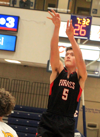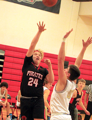 quarter points as Kellogg raced out to a 7-30 lead by the end of the period.Lorentz scored Prairie’s first 4 points. His first basket tied the game at 2-2 and his second ended a 0-12 Kellogg scoring run. Forsmann added a basket and Elven a free throw for Prairie’s other first quarter points. Kellogg slowed down the pace in the second quarter, taking off their press, and outscored the Pirates just 12-14 in the period as they took a 19-44 halftime lead. Forsmann scored 4 points for the Pirates in the quarter while Shears, Behler, Elven and Levi Gehring each scored 2. Behler opened the third quarter scoring with a basket then Kellogg scored the next 8 points before Shears broke the run with a lay-up. Kellogg then scored another 6 straight points before Elven scored. After another 4 points by Kellogg, Phil Schwartz finished off the third quarter with a putback. Kellogg led 27-62 after 3 quarters meaning the final quarter was played with a running clock. Each team scored 3 points in the fourth quarter with Kellogg’s coming on a 3 pointer then Prairie scoring the final 3 on a free throw by Lorentz and a lay-up by Shears. Forsmann and Shears led the Pirates in scoring with 6 points each. Lorentz and Elven scored 5 each. Behler scored 4 and Schwartz and Gehring scored 2 each. For Kellogg Riply Luna finished with 25 and his brother with 17. Rebounding was even with 26 each. Wemhoff, Forsmann and Shears each had 4 rebounds for the Pirates. Forsmann had 2 steals and Wemhoff had 4 assists. Prairie was 14 for 30 from the field, 47%, and 2 for 9 at the line, 22%. Kellogg was 23 for 47 from the field, 49%, and 9 for 18 at the line, 50%. Turnovers continued to plague the Pirates as they had 25 compared to 8 for Kellogg. The Pirates are now 1-7 on the season and 0-3 in league play. The JV team also played at the tournament but we have no results of their games available. Prairie 7 12 8 3 -30 Kellogg 30 14 18 3 -65 Prairie-Wemhoff 0-3, 0-1, 0; Lorentz 2-2, 1-5, 5; Hanson 0-1, 0-0, 0; Behler 2-5, 0-0, 4; Forsmann 3-4, 0-0, 6; Shears 3-6, 0-2, 6; Schwartz 1-2, 0-0, 2; Elven 2-4, 1-2, 5; Gehring 1-2, 0-0, 2; Rambo 0-0, 0-0, 0. 3-pointers-none. Kellogg-R. Luna 8-13, 4-7, 25; K. Luna 6-12, 4-7, 17; Whatcott 2-2, 0-0, 6; Miller 0-0, 0-0, 0; Hendrix 3-3, 0-0, 7; Taylor 3-10, 1-3, 7; O’Neill 1-2, 0-1, 3; Coburn 1-3, 0-0, 2; Maciosek 0-2, 0-0, 0; Robinson 0-1, 0-0, 0. 3-pointers-R. Luna 3, Whatcott 2, K. Luna, Hendrix, O’Neill. ![]() Trenton Lorentz puts up a jump shot against Shadle Park. ![]() Riley Shears goes for a lay-up against Shadle Park. ![]() Lee Forsmann and Riley Shears doubleteam a Pendleton player in the backcourt. ![]() Phil Schwartz with the ball in the Pendleton game. ![]() Levi Gehring in the game against Kellogg at Clarkston.. ![]() Noah Behler puts up a shot against Kellogg. In the background is Matt Wemhoff. ![]() Riley Shears scores a lay-up against Kellogg. *indicates league game NOVEMBER