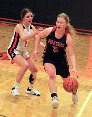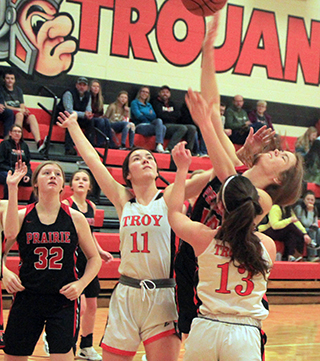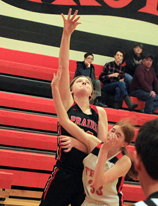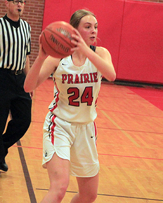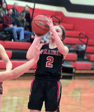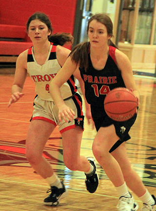 final 6 minutes of the first half.Prairie took a 3-0 lead on a basket by Lexi Schumacher and a free throw by Schlader. Kamiah answered with 8 straight points. Prairie then came right back with 5 straight points to tie the game at the end of the first quarter, 8-8. Wemhoff had a free throw. Kylie Schumacher made 2 free throws and a steal by Enneking led to the tying backet by Wemhoff. Kamiah opened the second quarter with a basket but Kylie Schumacher tied it with a free throw. Kamiah made two free throws to take the lead at 10-12 but that was to be their final lead of the game. Lexi Schumacher made back-to-back 3’s that kicked off a 22-0 run to end the first half. She then made 2 free throws as she scored 8 straight points. Sage Elven scored on a turn-around shot. Wemhoff scored a lay-up. Kylie Schumacher scored a putback. Wemhoff scored another layup. Elven scored down low. Geis and Hanson then each scored a putback to give Prairie a 32-12 halftime lead. Wemhoff stole the ball and scored to open the second half to make it a 24-0 scoring run. Kamiah finally broke back into the scoring column. Kamiah outscored Prairie the rest of the third quarter as they hit a couple of 3-pointers but were still down 43-24 heading into the fourth quarter. Wemhoff scored 6 in the quarter for Prairie while Schlader scored 3 and Elven 2. Kamiah outscored Prairie 5-12 to start the fourth quarter and got their deficit down to 12 points at 48-36. Wemhoff scored 2 and Schlader 3 for the Pirates in that stretch. Prairie then outscored Kamiah 5-2 to finish out the game. Kylie Schumacher made 2 free throws and a basket while Wemhoff added a free throw. Wemhoff wound up with 14 points to lead the Pirates in scoring. Lexi Schumacher and Kylie Schumacher each scored 10. Elven scored 8, Schlader 7 and Hanson and Geis 2 each. Prairie had a 52-41 advantage on the boards led by Kylie Schumacher with 13 rebounds. Elven had 9 while Schlader and Wemhoff each had 7. Wemhoff had 6 steals and 3 assists while Geis had 2 assists. Lexi and Kylie Schumacher each had 3 steals. Prairie was 20 for 64 from the field, 31%, and 11 for 21 at the line, 52%. Prairie also won a 2-quarter JV game 27-9. Nuxoll started the scoring with a lay-up and Kamiah tied it. Prairie then scored the next 19 straight points as they took a 21-2 lead early in the second quarter. Nuxoll put Prairie up for good with a putback then Shears made a pair of free throws. Elven stole the ball and scored then Shears scored a lay-up. Nuxoll stole the ball and scored then Lockett scored a putback. Elven made a free throw and then added a basket that made it 17-2 at the end of the first quarter. Shears scored 2 baskets to open the second quarter and complete the scoring run. Kamiah broke through with a basket and 2 free throws then Prairie scored 6 straight points. Shears scored on a bank shot. Elven scored on an inbounds feed from Lockett. Shears then scored when she rebounded her own missed shot to make it 27-6. Kamiah closed out the scoring with a basket and free throw. Shears led the scoring with 12 points with Elven scoring 7, Nuxoll 6 and Lockett 2. Prairie dominated the boards 34-9. Nuxoll and Shears each had 8 rebounds to lead the Pirates. Elven had 4 steals while Shears had 3. Lockett, Rehder and Elven each had 2 assists. Prairie was 12 for 40 from the field, 30%, and 3 for 4 at the line, 75%. Kamiah was 3 for 16 from the field, 19%, and 3 for 4 at the line, 75%. Prairie 8 24 11 10 -53 Kamiah 8 4 12 14 -38 Prairie-L. Schumacher 3-12, 2-2, 10; Wemhoff 6-16, 2-8, 14; Schlader 2-3, 3-7, 7; Hanson 1-3, 0-0, 2; K. Schumacher 3-11, 4-4, 10; Enneking 0-2, 0-0, 0; Geis 1-4, 0-0, 2; Elven 4-12, 0-0, 8. 3-pointers-L. Schumacher 2. Kamiah-Krogh 2, 4-5, 9; La. Landmark 3, 0-0, 7; Loewen 0, 0-0, 0; Hunt 0, 1-2, 1; Porter 2, 4-5, 9; A. Skinner 0, 0-0, 0; K. Skinner 2, 0-0, 6; Lo. Landmark 1, 0-3, 2; Schoening 2, 0-2, 4; Farris 0, 0-0, 0. 3-pointers-K. Skinner 2, La. Landmark, Krogh, Porter. At Troy In the game at Troy the Pirates started the game strong and finished it strong. In between the two teams played mostly even/Prairie outscored the Trojans 21-0 in the first quarter to take control of the game. Wemhoff got Prairie started with a pair of lay-ups then Lexi Schumacher hit a 3-pointer. After a free throw by Schlader, Hanson connected for 3. Lexi Schumacher drove