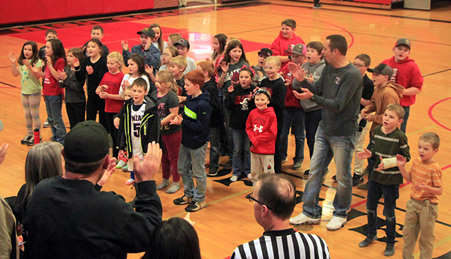Jon Rehder leads Prairie Elementary students, the Poeewee Pirates, in