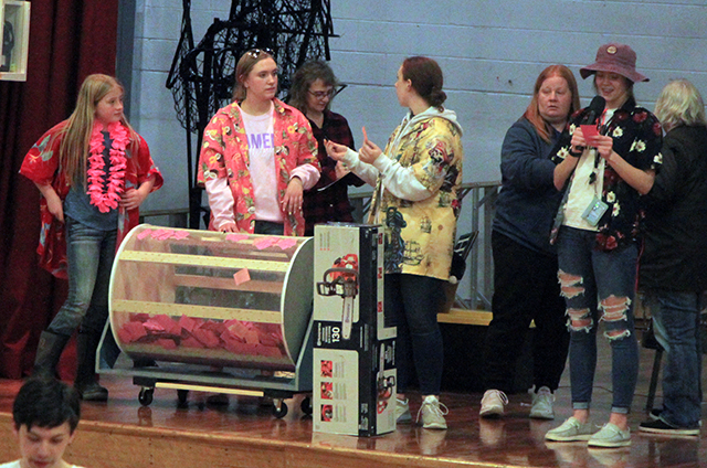 Enneking draw out the winning tickets while Tara Schlader, in the hat,