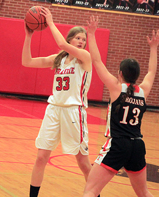called for a lane violation.Kamiah scored a basket to take the lead but Lexi Schumacher tied it with a lay-up. Kamiah then went on a 0-6 run for a 9-15 lead. Wemhoff closed out the first quarter with a lay-up to make it 11-15. Prairie dominated the scoring in the second quarter as they opened it with a 15-0 run. Kamiah didn’t score until making a free throw with 6 seconds left. Schlader picked up her third foul early on in the quarter then scored on a hook shot. Wemhoff scored on a full-court drive to tie the game at 15. Schlader then picked up her fourth foul and went to the bench for the final 5:34 of the half. Wemhoff hit a 12 foot jumper to give Prairie the lead and Elven followed with a pair of free throws. Lexi Schumacher scored a basket then Kylie Schumacher scored a pair of baskets before picking up her third foul. Wemhoff scored a free throw with 18 seconds left to make it 26-15. Kylie Schumacher then picked up her fourth foul that led to Kamiah’s lone point of the quarter. Coach Lori Mader took a chance in starting Kylie in the second half while leaving Schlader on the bench. Schumacher wound up fouling out a little more than a minute into the third quarter. Prior to that Hanson sank a 3-pointer and Wemhoff scored to make it 31-16. Kamiah then scored 7 straight points, 5 at the free throw line, to cut their deficit to 31-23. Prairie got back on the scoreboard as Lexi Schumacher hit a 3-pointer and Schlader made a lay-up. Hanson closed out the third quarter with a pair of free throws for a 38-23 lead. Prairie scored just 2 points in the fourth quarter, a basket by Wemhoff with 2:21 to play. Prior to that Kamiah had scored 6 straight points, including a 3-pointer by freshman Emma Krogh. Schlader fouled out with 3:13 to play leaving Prairie without either of their starting post players. Kamiah scored the game’s final 5 points, all by Krogh, to cut the final margin to 6. Each team was whistled for 19 fouls in the contest as the Kubs had 3 players finish with 4 fouls while Prairie had a pair with 3 fouls each in addition to the 2 that fouled out. Wemhoff wound up with 15 points to lead the Pirates in scoring. Lexi Schumacher scored 7, Hanson and Kylie Schumacher 6 each, Schlader 4 and Elven 2. Krogh led Kamiah with 18 points, 17 of them in the second half and 10 of Kamiah’s 11 in the final quarter. Prairie had a 40-36 edge on the boards with Wemhoff grabbing 12 to lead the Pirates while Kylie Schumacher had 8. Wemhoff had 4 steals while Schlader had 3. Elven had 3 assists while Schlader and Lexi Schumacher had 2 each. Prairie is now 18-4 on the season. Prairie 11 15 12 2 -40 Kamiah 15 1 7 11 -34 Prairie-L. Schumacher 3-11, 0-1, 7; Wemhoff 6-13, 3-8, 15; Schlader 2-2, 0-1, 4; Hanson 1-5, 3-5, 6; K. Schumacher 2-5, 2-2, 6; Geis 0-2, 0-0, 0; Enneking 0-0, 0-0, 0; Elven 0-2, 2-3, 2. 3-pointers-L. Schumacher, Hanson. Kamiah-Laney Landmark 2-7, 0-0, 4; Porter 0-1, 1-4, 1; Skinner 3-12, 1-3, 9; Logan Landmark 0-3, 0-0, 0; Schoening 1-9, 0-0, 2; Krogh 3-13, 10-12, 18; Hunt 0-0, 0-2, 0; Loewen 0-0, 0-0, 0. 3-pointers-Skinner 2, Krogh 2. ![]() Kristin Wemhoff picks up an assist as she passes to Lexi Schumacher who scored a lay-up against Troy in Prairie's District opener at Cottonwood. ![]() Riley Enneking dribbles toward the front court against Troy. ![]() Sage Elven looks to pass against Troy. ![]() Hailey Hanson goes after the ball against Kamiah. Also shown is Sage Elven. ![]() Lexi Schumacher drives toward the basket against Kamiah. PIRATES GIRLS BASKETBALL SCHEDULE FOR 2022-23 *indicates league game NOVEMBER