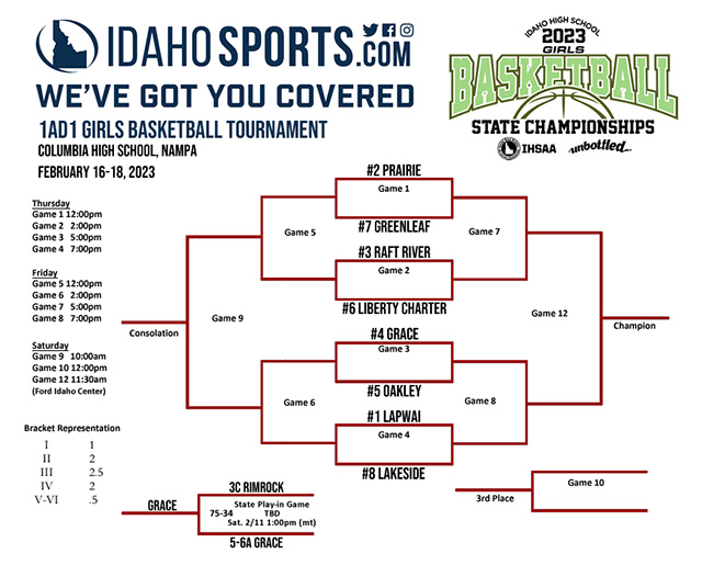 Lady Pirates to open against Greenleaf The Prairie Lady Pirates, 19-5, will open against District 3 runner-up Greenleaf, 17-4, at noon MST, Thursday, Feb. 16, at Columbia High School in Nampa. Prairie is the #2 seed into the tournament as they were the state’s second ranked team in the MaxPreps rankings with a 17.88 rating. Greenleaf was 14th ranked in the final regular season rankings but are 7th ranked among teams making the tournament. Higher ranked teams not making the tournament are #6 Kamiah, #7 Murtaugh, #8 Potlatch, #9 Carey, #10 Genesee, #11 Shoshone and #13 Lighthouse Christian. #8 seed Lakeside was #15 in the rankings. #3 Raft River, 21-3, plays #6 Liberty Charter, 14-6, following Prairie’s game at 2 p.m. #4 Grace, 19-4, plays #5 Oakley, 19-4, at 5 p.m. Lapwai, 23-1, is the #1 seed with a 23.84 rating and plays Lakeside, 13-6, at 7 p.m. MST. ![]() ![]() You need to order tickets online to get into the state games. Go to |