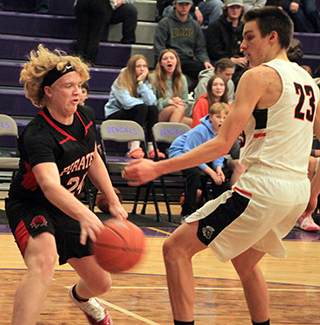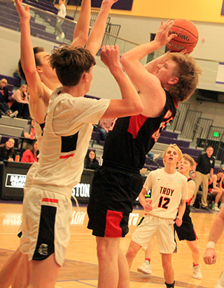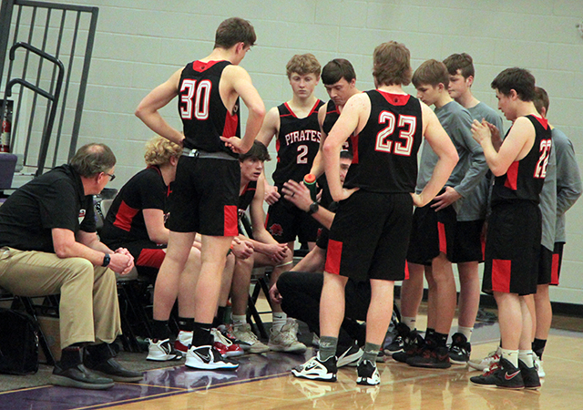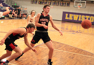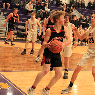 The Prairie Pirates’ season came to an end when they lost 30-39 to Troy on Tuesday, Feb. 21 at the District Tournament at Lewiston High School. ![]() The Pirates played well in the opening quarter but Troy took the lead in the second quarter and never gave it up. Shane Hanson scored the first points of the game on a putback. After Troy tied it Noah Behler put the Pirates back on top with a 3-pointer from the corner. Hanson then converted a 3-pont play for an 8-2 Prairie lead with 3:11 to go in the first period. Troy scored on an inbounds play to make it 8-4 with 2:47 left in the quarter and that’s how it stood at the end of the period. Troy scored the first 5 points of the second period to take their first lead of the game. Bennie Elven tied it with a free throw then Troy scored 5 straight to retake the lead. A 3 by Behler cut the lead to 2 but Troy answered with a basket. A 3 by Lee Forsmann cut the lead to 1 but Troy answered with a basket. Another 3 by Forsmann tied the score at 18-18 with 46 seconds left in the half. Troy’s Eli Stoner made a pair of free throws to give Troy an 18-20 halftime lead. Troy’s Noah Johnson scored the first 3 points of the second half but a free throw by Riley Shears and a tip-in by Forsmann of Shears’ missed second free throw cut the lead back to 2 at 21-23. Troy scored a pair of baskets before Hanson scored a lay-up. Hanson then picked up his fourth foul on a basket by Johnson who missed the ensuing free throw. That put Troy up 23-29. Prairie cut the lead back to 2 by the end of the quarter on a basket each by Shears and Forsmann. In the fourth quarter Prairie seemed content to run clock down and keep it close in hopes of stealing a win at the end. Neither team scored until Troy got a basket with 6:30 left to push their lead to 4. It was over 4 minutes before Troy scored again to make it 27-32 with 2:38 left. Prairie didn’t score in the quarter until a steal by Behler that led to a free throw by Forsmann with 50 seconds left. At that point Prairie started shooting 3’s while Troy would get the rebound and score at the other end. Troy scored 7 straight points to take a 28-39 lead. With 5 seconds left Troy had the ball out on the side in Prairie’s end. With the game out of reach coach Tim Scheffler had put senior Ryan Wemhoff into the game to finish out his career on the floor when Prairie’s other senior, Hanson, had fouled out. Troy’s Chandler Blazzard had the ball out and yelled “hey 22” and motioned him toward Prairie’s basket. He then tossed the ball in to Wemhoff who put the ball in the basket, scoring the final points of the Prairie season and his high school career. We guess that would go into the stats as a steal for Wemhoff. Forsmann wound up with 11 points and 9 rebounds to lead the Pirates in both categories. Hanson scored 7, Behler 6, Shears 3, Ryan Wemhoff 2 and Elven 1. Troy had a 27-35 edge on the boards. Matt Wemhoff had 3 steals and Behler had 3 assists. Prairie was 11 for 40 from the field, 28%, and 4 for 7 at the line, 57%. Troy was 15 for 42 from the field, 36%, and 8 for 14 at the line, 57%. Prairie ends their season with a record of 6-18. Prairie 8 10 9 3 -30 Troy 4 16 9 10 -39 Prairie-M. Wemhoff 0-3, 0-0, 0; Shears 1-5, 1-2, 3; Hanson 3-10, 1-1, 7; Behler 2-10, 0-0, 6; Forsmann 4-9, 1-2, 11; Elven 0-1, 1-2, 1; Lorentz 0-1, 0-0, 0; R. Wemhoff 1-1, 0-0, 2. 3-pointers-Behler 2, Forsmann 2. Troy-Stoner 4-9, 2-2, 11; Blazzard 2-3, 0-0, 4; Holden 2-8, 3-4, 7; Johnson 5-8, 1-4, 11; Bendel 1-6, 2-4, 4; Doumit 0-5, 0-0, 0; Durrett 1-1, 0-0, 2; Tyler 0-2, 0-0, 0. 3-pointers-Stoner. ![]() Shane Hanson looks to put up a shot against Troy at District. Also shown is Matt Wemhoff. ![]() Matt Wemhoff is caught with the ball near the baseline under the basket and looks to pass. Also shown are Trenton Lorentz and Shane Hanson. ![]() Noah Behler makes a bounce pass past a Troy defender. ![]() Trenton Lorentz and Lee Forsmann look to chase after a loose ball. ![]() Coach Tim Scheffler talks with the team during a timeout. *indicates league game NOVEMBER