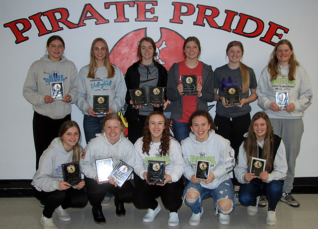 Prairie girls basketball awards were given out Monday, March 6. Back from left are Elizabeth Severns, JV Most Improved; Alli Geis, Varsity Employee Award (for the way she checks in every day and always does the work); Tara Schlader, Varsity co-Captain and co-Most Valuable; Kylie Schumacher, Varsity Rookie of the Year; Hailey Hanson, Varsity Defense Award and Sage Elven, JV co-Most Valuable. Kneeling from left are Lexi Schumacher Varsity Pirate Award; Kristin Wemhoff, Varsity co-Captain and Co-Most Valuable; Riley Enneking, Varsity co-Captain; Kaylie Lockett, JV co-Most Valuable and Sydney Shears, JV Chairman of the Boards. Not pictured is Ellie Nuxoll who was the Pirate Award winner for the JV team. Lady Pirates Softball season cancelled The Prairie Softball season has been cancelled as they wound up a couple players short of being able to field a team this season.