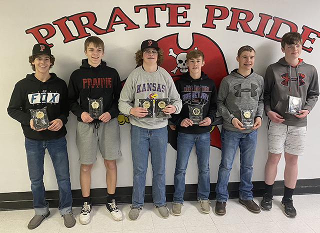 Briggs Rambo, 6th Man; Logan Weber, Most Improved and Rebounding Award; Phil Schwartz, Pirate Award; Levi Gehring, Hustle Award and Nate Forsmann, Most Valuable. Photo by Matt Elven. Click on the