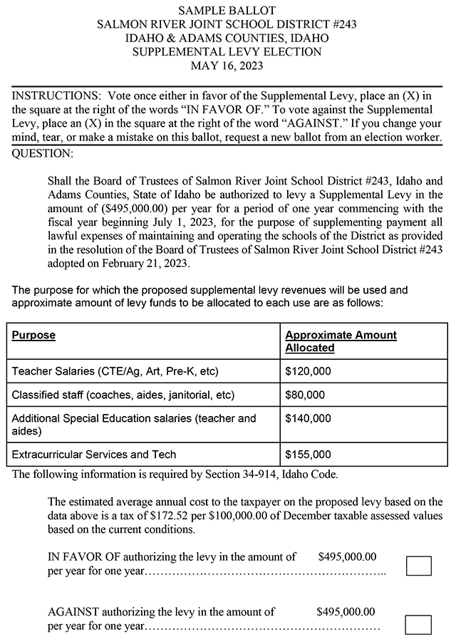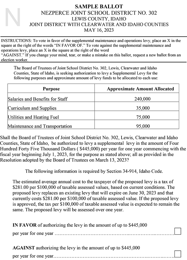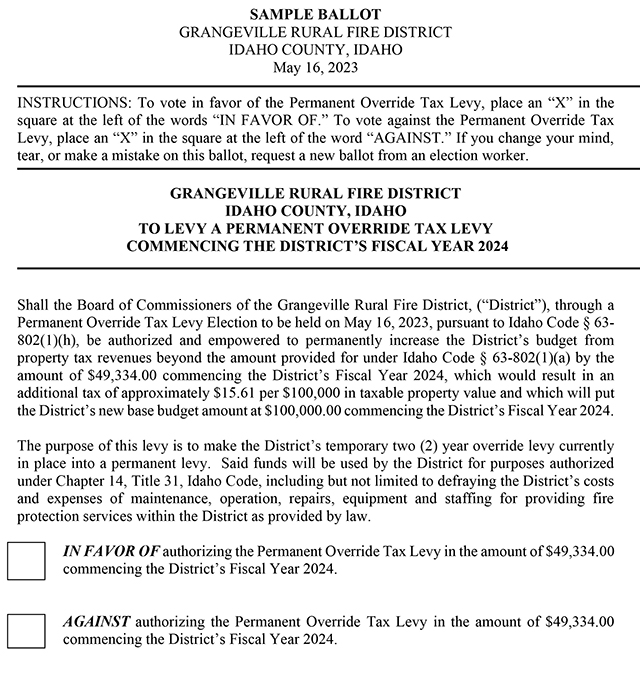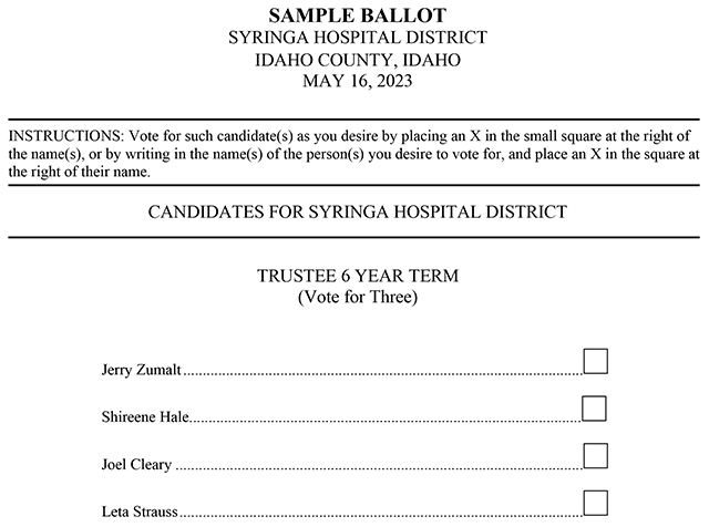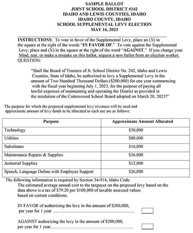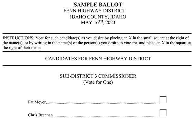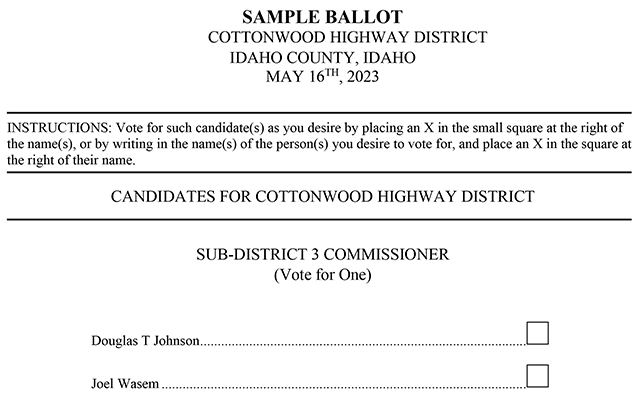 Next Tuesday, May 16 is election day. The only item on the ballot for most local Chronicle readers would be the School District #242 override levy. There is also a contested election for Cottonwood Highway District commissioner for subdistrict 3. For those in the Fenn Highway District or Grangeville Rural Fire District, they also each have a contested commissioner election. Sample ballots can be found below Polls will be open from 8 a.m. to 8 p.m. ![]() ![]() ![]() Other sample ballots for some Idaho County voters: ![]() ![]() ![]() ![]() |