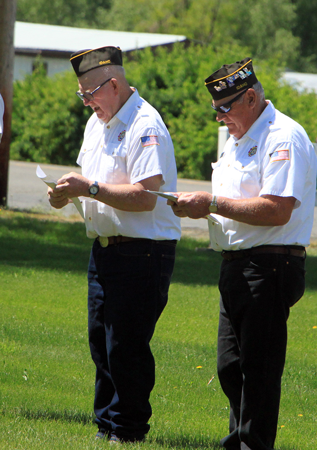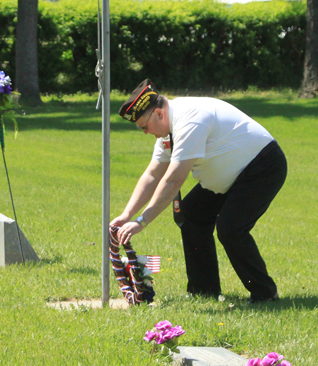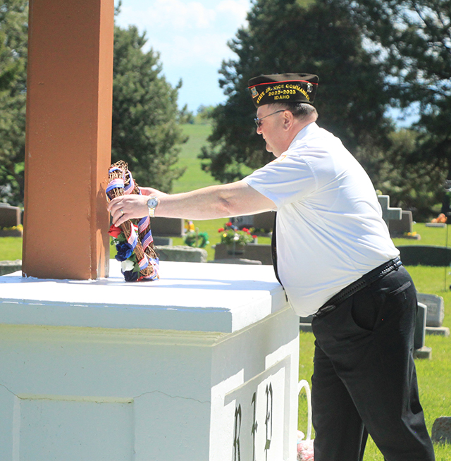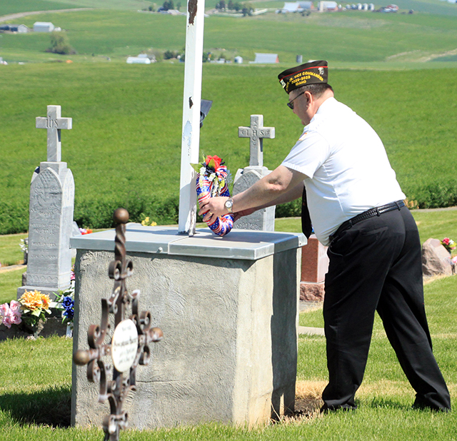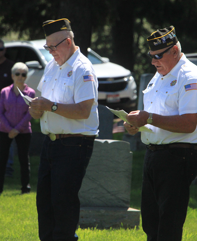 Joe Riener lays the wreath at the Greencreek Cemetery. Roy Arnzen and Jim Schumacher read the names of veterans buried at the Greencreek Cemetery. The