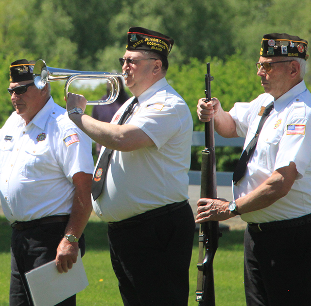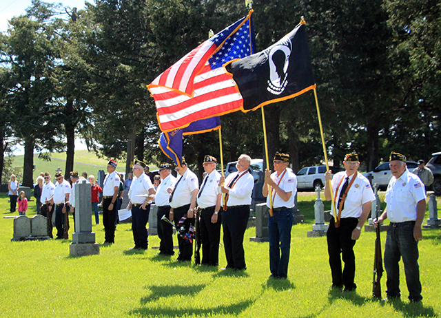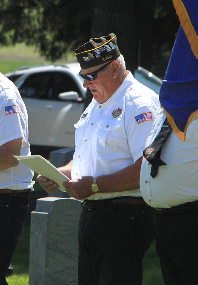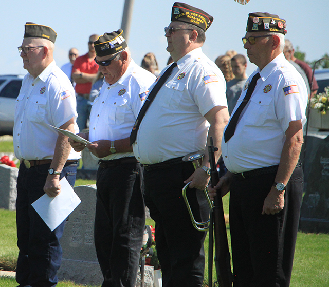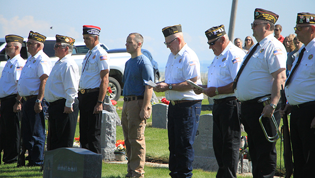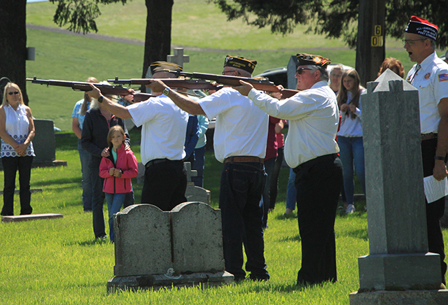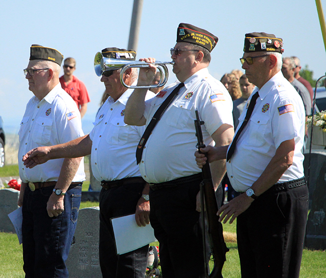 rifles. Joe Riener plays "Taps" at the Greencreek Cemetery. Jim Schumacher reads "In Flanders Field" at the Greencreek Cemetery. Lined up prior to the start of the service at Cottonwood Catholic Cemetery. Joe Riener places the wreath at the Cottonwood Catholic Cemetery. Jim Schumacher reads the prayer that was said at all three services at the Cottonwood Catholic Cemetery. The Gun Salute at Cottonwood Catholic Cemetery. Jim Schumacher reads "In Flanders Field" at the Cottonwood Catholic Cemetery. Joe Riener lays the wreath at Cottonwood Community Cemetery. Roy Arnzen and Jim Schumacher read the names of those buried in Cottonwood Community Cemetery. The gun salute at Cottonwood Community Cemetery. Joe Riener plays "Taps" at Cottonwood Community Cemetery.