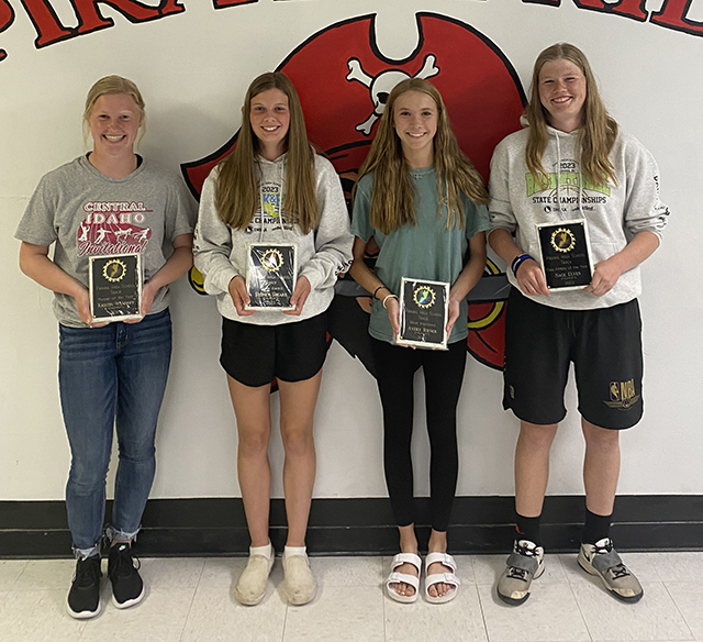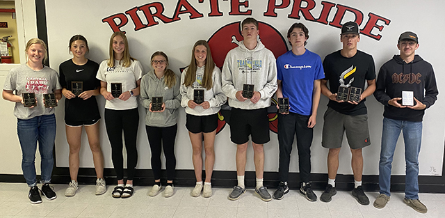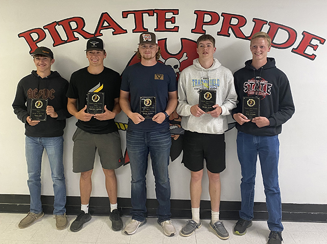 Track awards given ![]() Prairie Boys Track award winners. From left are Noah Geis and Trenton Lorentz, co-Runners of the Year; Shane Hanson, Field Athlete of the year; Bennie Elven, Pirate Award and Zane Uptmor, Most Improved. Photo by Matt Elven. ![]() ![]() Those who broke a school record or were part of a relay that broke a school record are shown with plaques. From left are Kristin Wemhoff, 400 meter dash and 4x100 relay; Julia Rehder, Alli Geis and Sierra Oliver, also 4x100 relay; Sydney Shears, 800 meter run and Bennie Elven, Ben Secrest, Trenton Lorentz and Noah Geis, 4x100 relay. Lorentz also broke the 200 meter dash record (3 times) while Oliver tied the girls pole vault record. Photo by Matt Elven. |