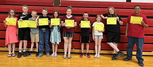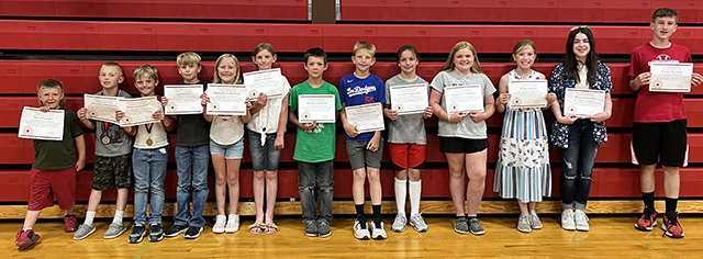 Elementrary School Talent Show winners: L to R: Zeke Henry and Claire Michels- 1st place, Mesa Graning, 2nd place, and Zita Schmidt and Madalynn VonBargen- 3rd place. Photo by Megan Rambo. ![]() Kindergarten - 3rd grade Top Math awards: L to R: Leo Rehder, Mason Westhoff, Elijah Ratcliff, Jude Kennedy, Jackson Ross, CieranTacke, Micah Hotlhaus, Jacob Holcomb, Gage Uhlenkott, Kruz Forsmann, Justin Labrum, Madi Uhlenkott, Claire Michels, Clareese Duclos, Landon Jones, and Sawyer Stewart. Photo by Megan Rambo. ![]() 4th-6th grade Top Math awards: L to R: Lydia Francis, Tenley Riener, Brody Kalmbach, Kohen Forsmann, Gloria Terhaar, Madelyn Holcomb, Koyle Jones, Nicole Gehring, Kamden Downing, Marshall Campbell, Derek Goeckner, and Ayla Ratcliff. Photo by Megan Rambo. |
