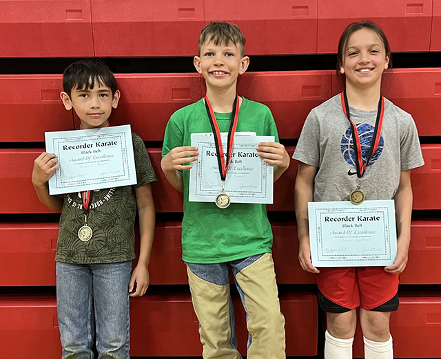 Recorder Black Belt awards: Isaac Riener, Branch Bennett, and Kinzie Coppernoll. Photo by Megan Rambo.