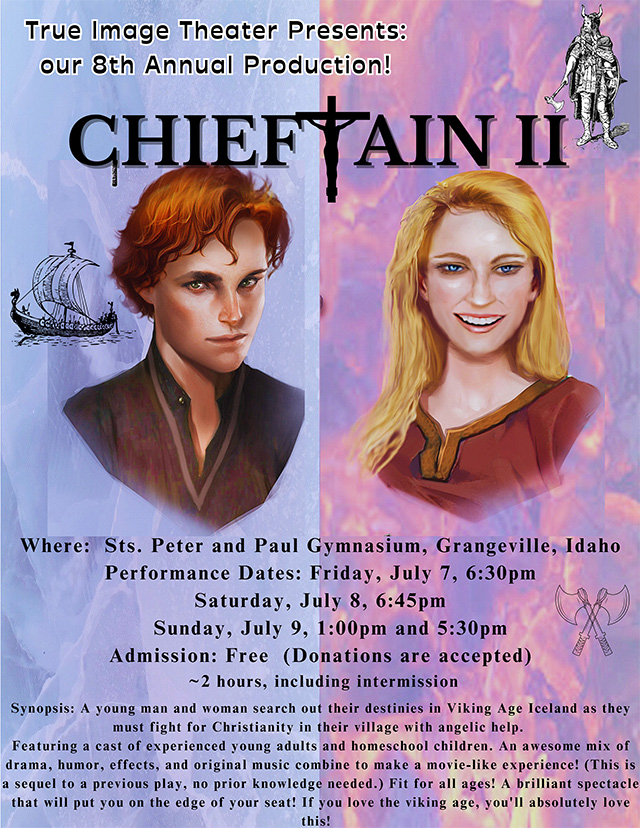 True Image Theater is eager to perform its 8th annual summer musical. “Chieftain 2: A Tale of Hidden Helpers in Iceland” is the sequel to a play we presented six years ago. No knowledge of that play is needed to enjoy this play. Our story takes place in Viking Age Iceland (1000 AD) when Catholicism has transformed a Viking village. Amidst raids from a neighboring chieftain and villainous treachery within, our two main characters, Ansgar and Kaia, struggle to find their way in life. When Ansgar’s older brother, Bjorn, the chieftain of the village, disappears, the village looks to Ansgar to lead them. However, Ansgar feels a call to discern the priesthood and so he must decide which path is his to take. Three villains and life’s complexities will stand in his way to fulfill his destiny. With hidden helpers, our heroes must forge their way ahead in a wild world. With songs and battles, the play is designed to be very wholesome, humorous, and engaging, all the while plumbing the depths of life’s hardest questions. If you love your faith, and Vikings, you will love this original story performed by an experienced cast! Please consider coming to this in order to support the wholesome pursuit of art and entertainment on the Prairie! All four performances will be held at Sts. Peter and Paul School Gymnasium in Grangeville on Friday July 7, at 6:30PM; Saturday July 8, at 6:45 PM; and Sunday July 9, at 1:00 PM and 5:30 PM. Admission is free, donations are accepted. ![]() |