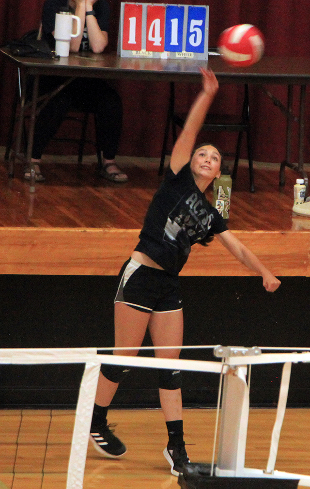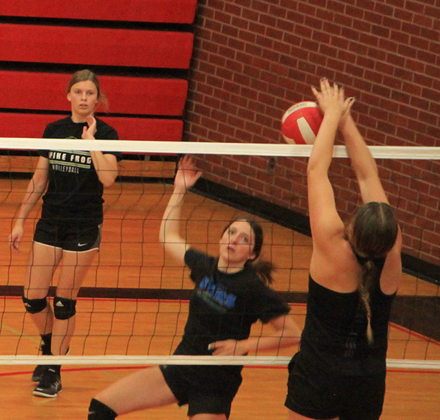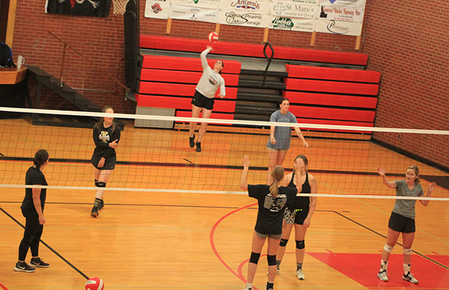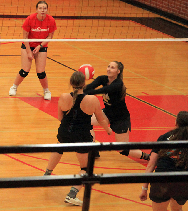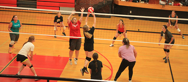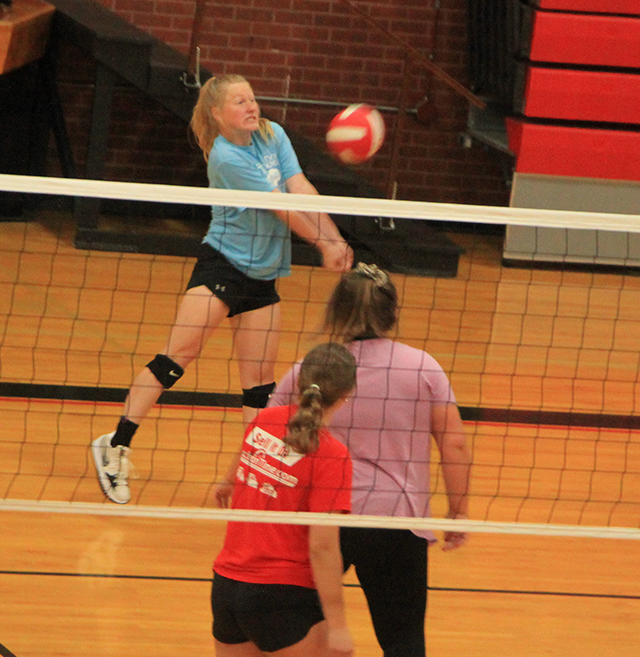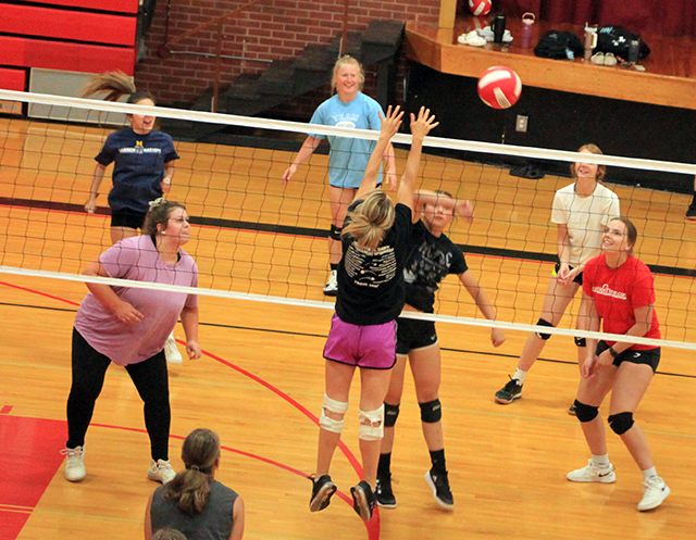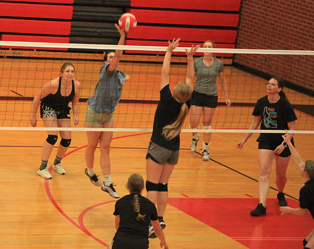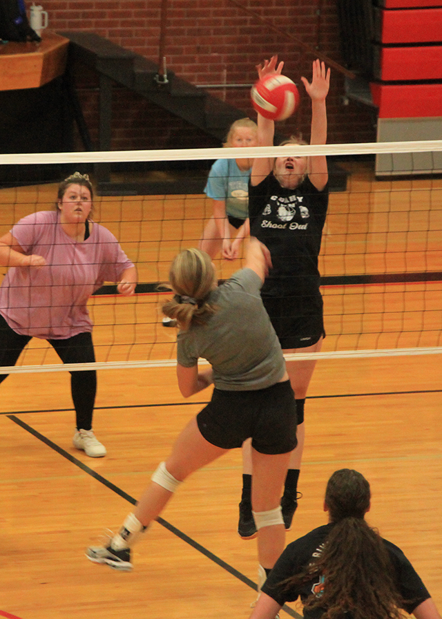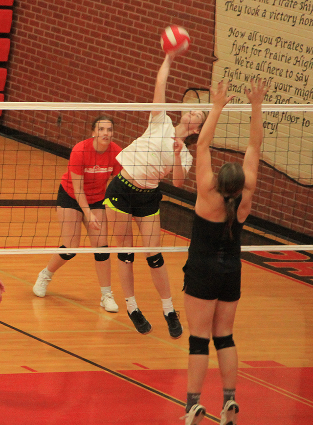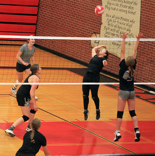 Alumni Volleyball Tournament is held The second annual Prairie Alumni Volleyball Tournament had 4 teams competing Wednesday, June 28. There were 3 teams made up of alumni and the Prairie varsity team filled in as the fourth team. The team that included 3 members of the back-to-back state volleyball champions of 2014-2015 wound up winning the tournament, dropping just 1 set along the way. The team of Hailey Danly, Krystin Uhlenkott Schlader, Shayla VonBargen, Kyndahl Ulmer Bruner, Jamie Chicane Scheffler and Kim Riener Harman faced off against the Prairie varsity team in the first round and won 2 games to 0. Alli Geis, Hailey Hanson, Sierra Oliver, Aubree Rehder, Kaylie Lockett, Lexi Schumacher, Tamden Pecarovich and Sydney Shears were the players available for the Prairie varsity. In the other first round matchup the recent grads team of Kristin Wemhoff, Tara Schlader, Julia Rehder, Laney Forsmann, Ali Rehder, Hope Schwartz and Delanie Lockett won 2 games to 0 over the veteran team in the tournament. Julie Wren Schumacher, Vikki Duman Riener, Renee Arnzen Rehder, Erika Forsmann Shears, Francesca Johnson Forsmann and Shandrie Poxleiter Stigum made up that team. The winners matched up with the champions team taking an early lead then falling behind and losing after a big serving run by Julia Rehder for the recent grads. The champions team came back to win big in the second game and won the third game to take the championship. In the third place match with 3 sets of mother-daughter matchups, the Prairie varsity team defeated the veteran team 2 games to 0. They then played a third game also won by the younger squad. The Prairie varsity finished off the night with a 1-game match against the recent grads with the alumni pulling out a close win. ![]() On the far side of the net is the winning team at the Prairie Alumni Volleyball Tournament. The team includes 3 players from the 2014-15 back to back state champions. Serving is Jamie Chicane Scheffler. From left are Kim Riener Harman, Hailey Danly, Kyndahl Ulmer Bruner, Shayla VonBargen and Krystin Uhlenkott Schlader. They were playing the Prairie varsity in an opening round match. Alli Geis is shown at the net for the Lady Pirates. ![]() Vikki Duman Riener slams a ball over Kristin Wemhoff's block attempts. Also at the net is Laney Forsmann. In the back are Hope Schwartz and Julia Rehder. Behind Riener is Julie Wren Schumacher. The team of recent grads on the far side of the net won this match and placed second in the tournament. ![]() Krystin Schlader serves as Hailey Danly looks back. ![]() Julia Rehder manages to hit the ball past Erika Forsmann Shears' block attempt. On Rehder's side are Hope Schwartz, Ali Rehder, Kristin Wemhoff, Tara Schlader and Delanie Lockett. Behind Shears is Vikki Riener. ![]() Hailey Hanson attempts to block Kyndahl Bruner's hit at the net. Also shown are Shayla VonBargen, Krystin Schlader on one side of the net and Sydney Shears and Tamden Pecarovich in the foreground. ![]() Erika Shears sets the ball as Laney Forsmann and Delanie Lockett watch from the other side of the net. ![]() Kim Harman goes up for a spike against Alli Geis. Harman's teammates shown are Shayla VonBargen and Krystin Schlader. In the foreground is Sydney Shears. ![]() Laney Forsmann goes up for a tip. Her teammates from left are Tara Schlader, Julia Rehder and Hope Schwartz. On the other side from left are Shandrie Poxleitner Stigum, Erika Shears, Julie Schumacher, Renee Arnzen Rehder, Francesca Johnson Forsmann and Vikki Riener. ![]() Shayla Von Bargen blocks a ball hit by Aubree Rehder. Also shown is Sydney Shears. ![]() Kristin Wemhoff digs a serve as Hope Schwartz and Delanie Lockett watch. ![]() Hailey Danly sets the ball in front of Shayla VonBargen. Also shown are Delanie Lockett upper left and Jamie Scheffler, lower right. ![]() Tara Schlader attempts to spike the ball past Shayla VonBargen in the championship match as Delanie Lockett watches. ![]() Julia Rehder had a big service run that turned around the first game in the championship match and led to the only set loss by the championship team. ![]() Laney Forsmann blocks a spike by Krystin Schlader. Also shown are Hope Schwartz and Kristin Wemhoff on the far side of the net and Jamie Scheffler, lower right. PIRATES GIRLS VOLLEYBALL