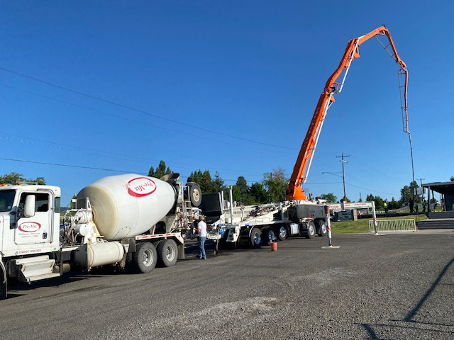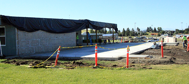 The concrete slab for the new classroom addition at Prairie Elementary School has been poured (top photo). The lower photo shows the use of a concrete pumper to pour the slab. Lower photo by Jon Rehder. Click on each photo for a larger view.