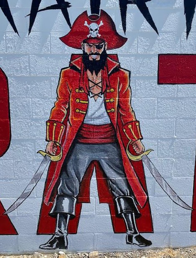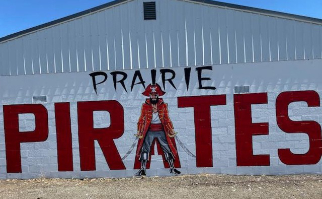 Prairie art teacher Shane Chapman painted a new mural on the west side of the football fieldhouse. It replaces the former mural which had faded. The switch was made from a football player to a Pirate since the complex is now both a football and track and field complex. Photos by Jon Rehder. Click on each photo for a larger view.